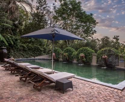 TThe 4-star Shangri-La Country Hotel & Spa outside Bela Bela is a tranquil secluded hideaway nestled against the Waterberg Mountains. This peaceful gem just one hour north of Gauteng, offers the elegance of yesteryear, with beautiful antiques, homely pampering in 49 en-suite rooms surrounded by lush tropical gardens. All the comfortable rooms and rondavels at Shangri-La are situated within walking distance of a sparkling swimming pool, relaxing spa as well as other facilities including two restaurants and a cellar (with a Diners Club award winning wine list), a small wedding chapel and fully equipped conference centres.