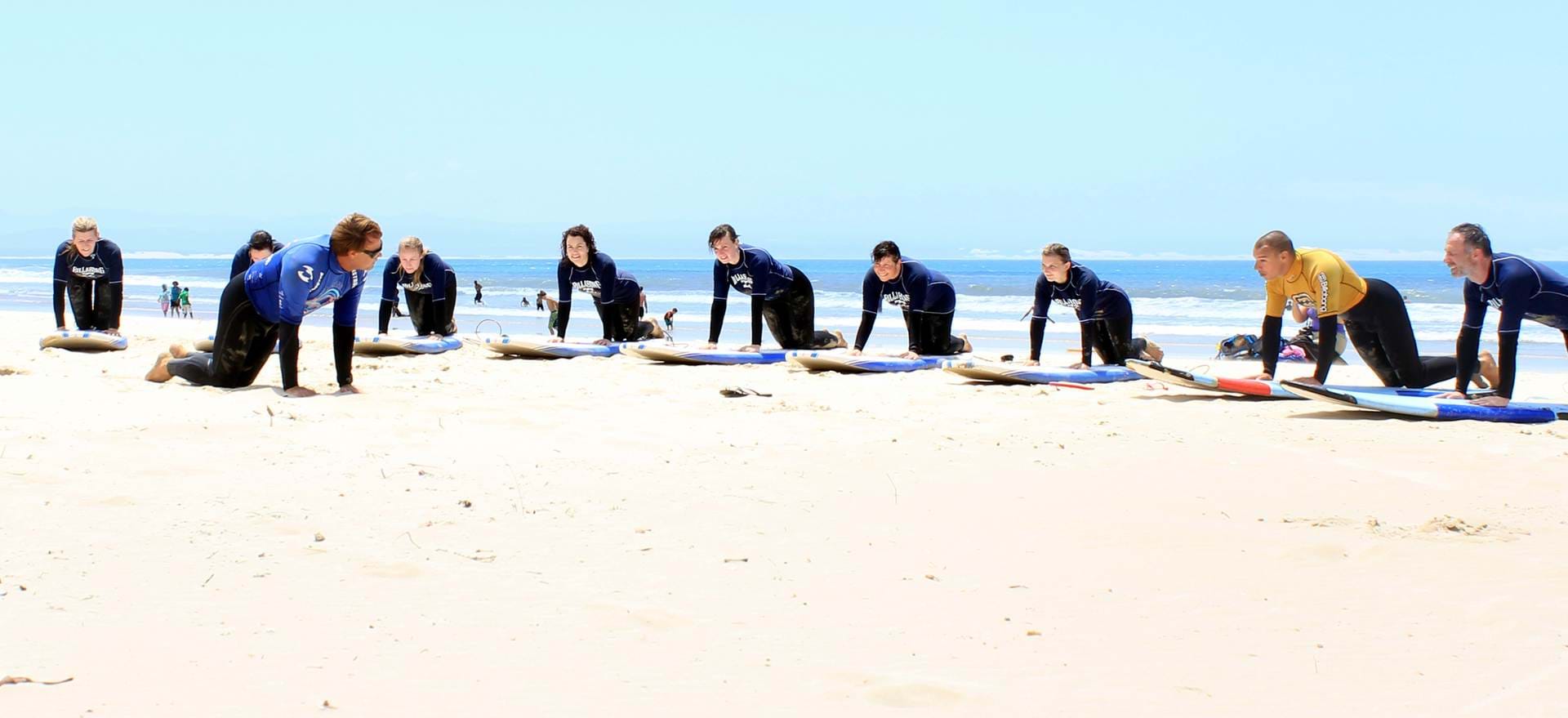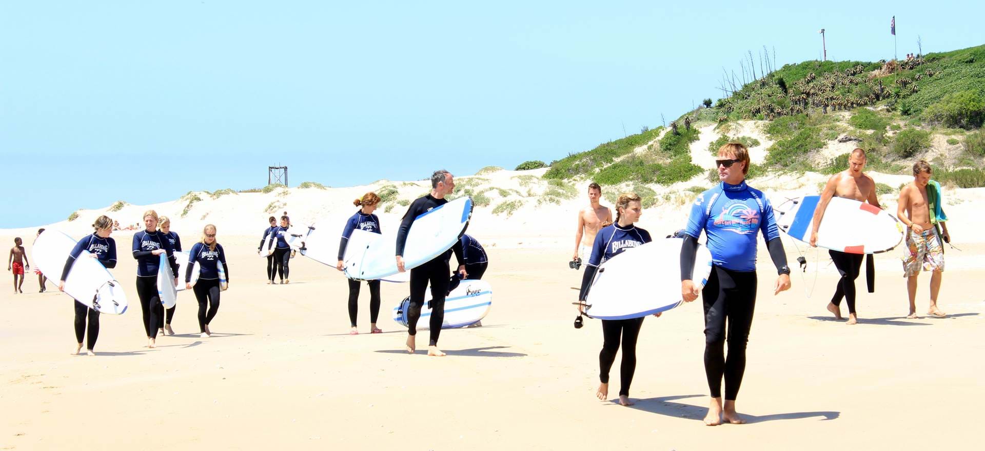 DDer Kilometer lange, weiße Sandstrand mit dem türkisblauen Meer lässt uns an Faulenzen in der Sonne denken. Doch ehe wir uns versehen, stecken wir in hautengen Neoprenanzügen und laufen mit unseren Surfbrettern den Strand entlang. Die bis zu drei Meter hohen Wellen von Jeffreys Bay sind legendär und erzeugen in unserer Gruppe weiblicher Surf-Anfänger ein wenig Unwohlsein. Unser Surflehrer James grinst gelassen und deutet auf einen Punkt weiter unten am Strand, den er als besten Einstiegsort für uns ausgemacht hat. Kein Wölkchen ist am Himmel zu sehen und bei 30 Grad Lufttemperatur fühlen wir uns eher an einen Marsch durch die Sahara erinnert als an einen Strandspaziergang. Das Schmunzeln der Einheimischen, für die zu dieser Jahreszeit noch eher Frühling als Sommer herrscht, entgeht uns dabei nicht. Doch schon bald sollen wir für unsere Anstrengung belohnt werden. Geduldig erklärt uns James die wichtigsten Grundregeln und Techniken.