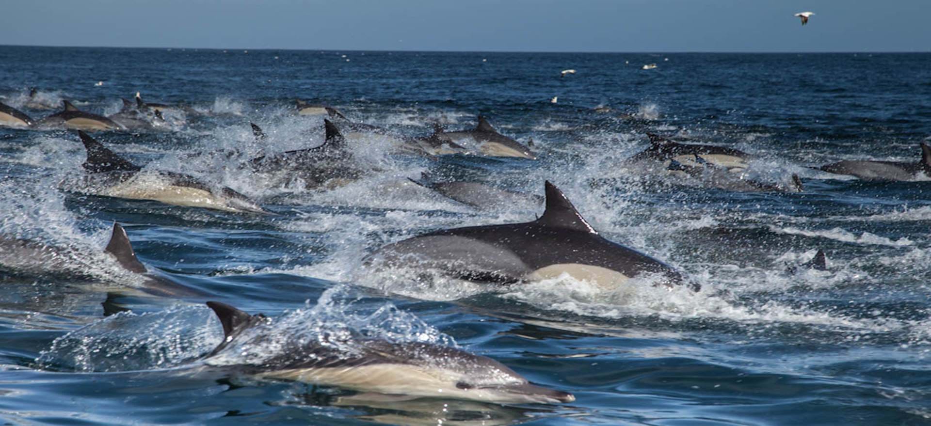 Die Delfine schnellen direkt vor unserer Nase durch das kühle Nass. Mit gekonnten Bewegungen trennen sie kleinere Fischschwärme aus dem Schutz des Riesenschwarms und treiben sich die entstehenden Baitballs zu, die damit leichte Beute sind. Während ich fasziniert ihrer Jagd zuschaue, kommen auf einmal von allen Seiten weitere Räuber heran. Haie und riesige Tümmler bahnen sich ihren Weg durch die Sardinen, während vom Himmel Albatrosse und Tölpel aus bis zu 30 Meter ins Wasser schießen. Ich bin so aufgeregt, dass meine Hände zittern und weiß nicht, wo ich zuerst hinschauen soll.
