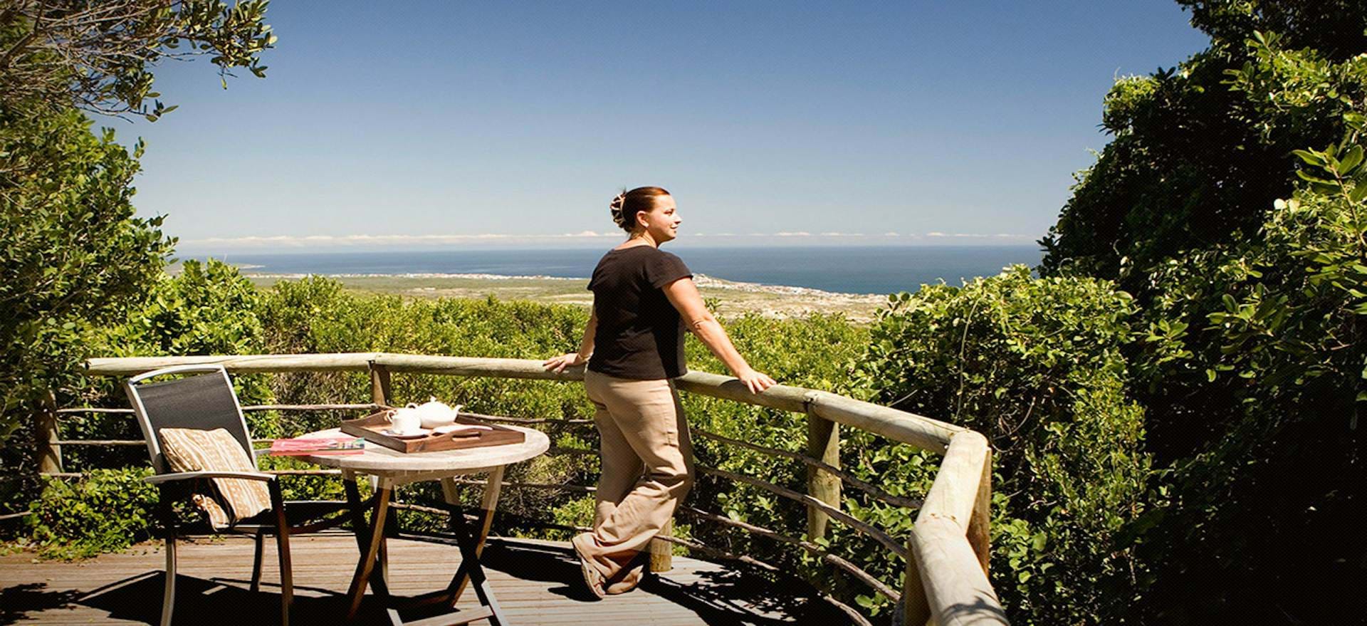 DDie Lodge liegt oberhalb der Walker Bay. Unter uns liegen der sichelförmige, fast weiße Strand und das Meer. Die Auswahl der Aktivitäten auf Grootbos ist groß. Die Reitergruppe zieht es zum Ausritt an die Küste, andere aufs Meer, um weiße Haie aus der Nähe zu sehen oder die südlichen Glattwale, die jedes Jahr von Juni bis November in der Bucht zu finden sind.