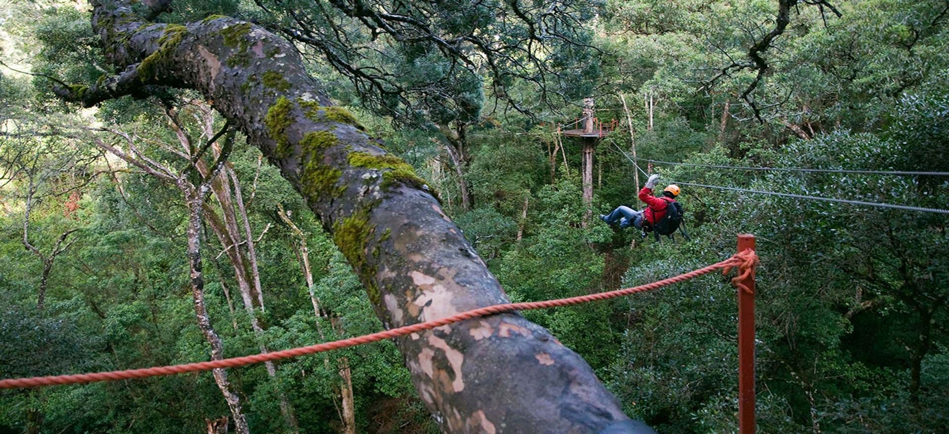 KKommt alles noch. Ich weiß nicht, wie lange wir in den Bäumen spazieren gegangen sind. Man konzentriert sich nur auf diesen Schwebezustand, der so einzigartig ist. Für diese klitzekleine Fahrt am Seil ist man ganz mit sich alleine. Rundherum nur das herrliche Grün dieser uralten und sehr großen Bäume. Bei manchen Plattformen kann man ganz weit an den Stämmen herunterschauen. Eine atemberaubende Perspektive. Also, für heute jedenfalls war die Nummer 99 meine Glückszahl!