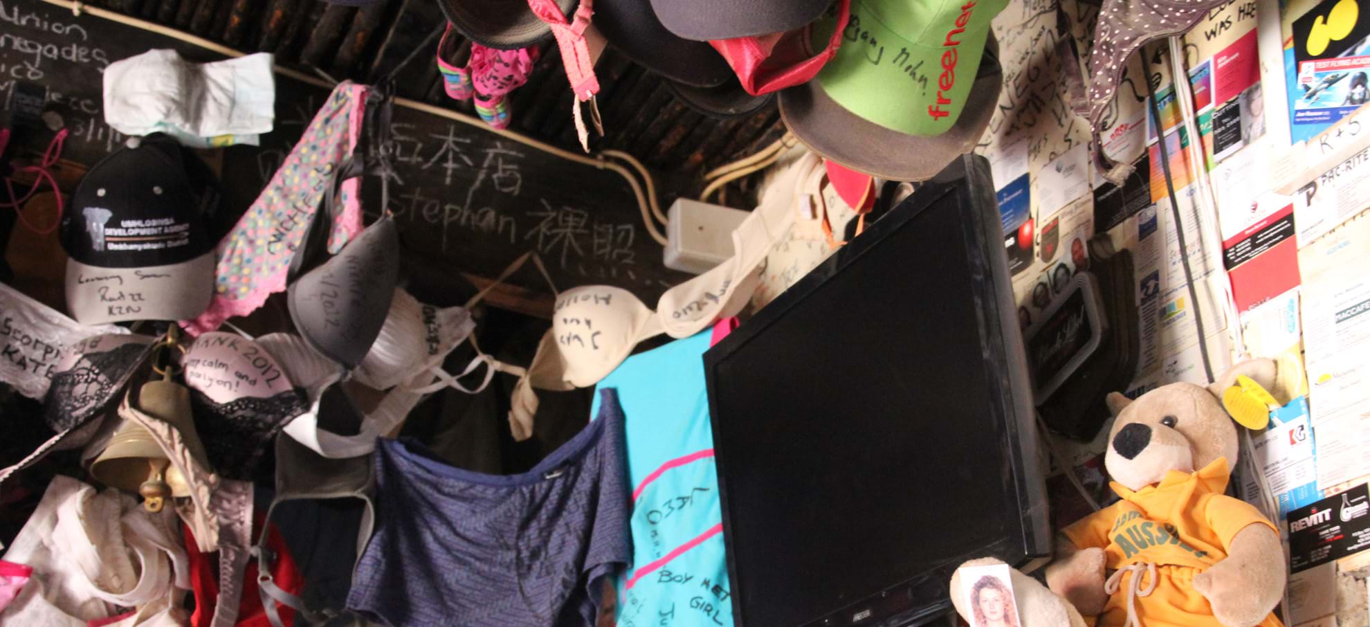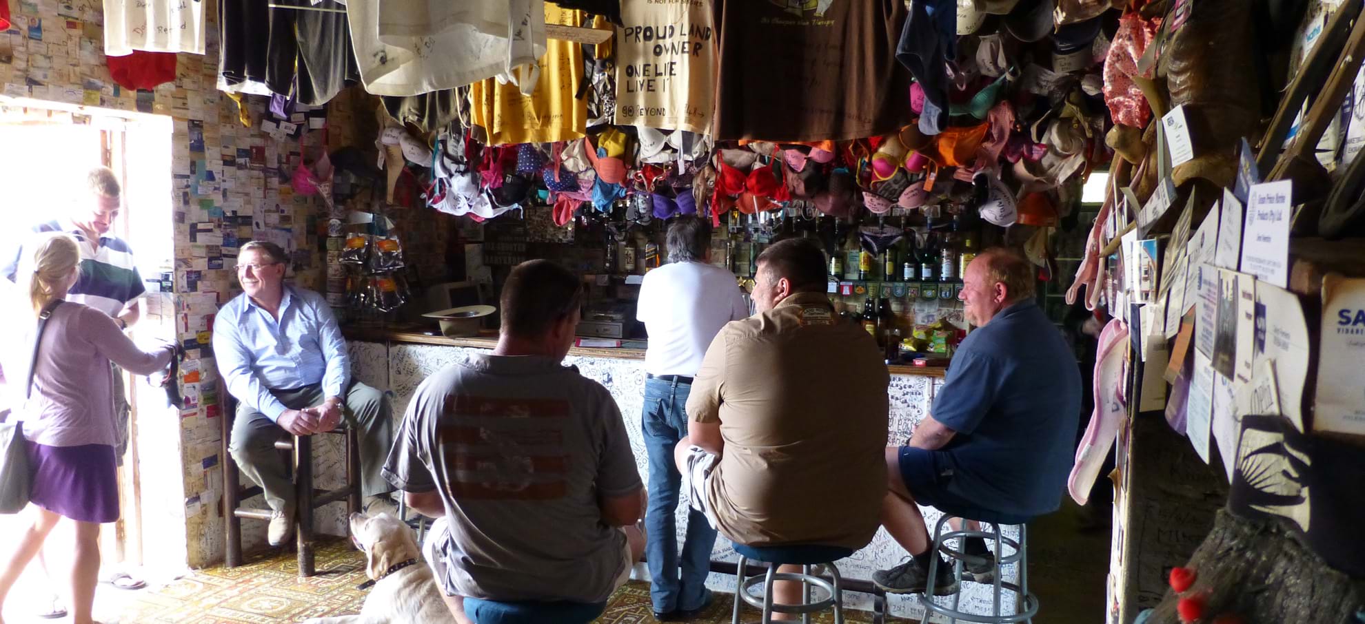 Wir sind gespannt, was uns im Pub erwartet. Denn Ronny sammelt ganz besondere Trophäen: Von der Decke hängen hunderte BHs, in allen Farben, in allen Körbchengrößen, mit und ohne Polster. Staunend wandeln wir durch die Räume. Jeder, der hier einkehrt, hinterlässt etwas. Die Wände sind mit Visitenkarten tapeziert. Adressen von überall aus der Welt, von Menschen mit den unterschiedlichsten Tätigkeitsfeldern und Berufen.