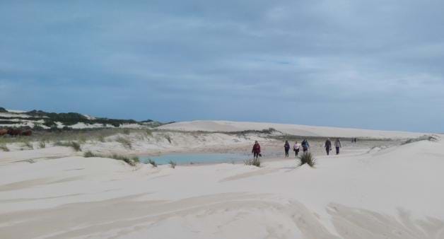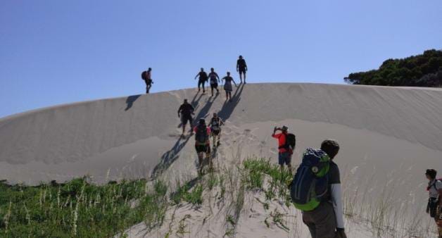 TThe Chokka Trail is a 4 day/3 night hiking holiday in the greater St Francis area between Oyster Bay, St Francis Bay and Cape St Francis in the Eastern Cape, South Africa. This trail is so much more than just a hiking trail, it is a journey through the Coastal Cradle of Mankind, offering the full beach experience, it is educational, informative, adventurous. Hikers are active and get their excersize but have no worries about any logistics – the hike is fully guided, catered for and includes luggage transfers – it is a healthy, carefree and relaxing activity, all while you enjoy our beautiful South Africa. The hike includes a visit to Port St Francis, the only privately owned working harbour in South Africa and home to the chokka (squid) industry, where the trail’s name derives from. At the Port, hikers enjoy a calamari tasting – comparing local squid with imported squid as well as a chokka cleaning demonstration. Various heritage sites are visited over the four days, such as the ancient fish traps in Oyster Bay, various middens in the dune field and along the coastline as well as two shipwrecks, one from 1868. It also includes a visit to the SANCCOB Sea Bird Rehabilitation Centre, a cruise on the famous St Francis Bay canals and the farewell lunch includes a tasting of locally brewed beer. Fat Bike Rides on the Oyster Bay beach as well as surfing lessons can be added to the experience. The 62km hiking holiday kicks off with a 15km hike along the untouched coastline between Oyster Bay and Thysbaai, where the cape clawless otter often puts up a show in shallow waters. If you are not lucky enough to see small buck, you will find their spoor on the beach and the birdlife is prolific. Swimming, fishing and snorkelling are possible in the warmer summer months. The Oyster Bay Dune Bypass System, fondly called the Sand River, is a 16km sand of sea, to be conquered by hikers on day 2. The trail leads from Oyster Bay into the Dune Ridge Nature Reserve on the outskirts of St Francis Bay, and could be the most challenging of the 4 days. The moving dune field sometimes opens century old middens, protecting pot shards, bones, teeth and huge shells for future generations to see. The wetlands become a hive of bird activity during the wet months, changing the scenery completely. The last two days cover the rest of the shoreline into St Francis Bay, with many highlights – the second largest blow hole in southern Africa, an unknown Khoi grave, shipwrecks, more middens, the tallest masonry lighthouse situated on the south eastern most point of Africa as well as a visit to the SANCCOB Seabird and Penguin Rehabilitation Centre. The last evening is celebrated with a sundowner cruise on the St Francis canals, the most successful manmade canal system in South Africa. The final day includes the tour of Port St Francis where they can see the large fleet of chokka boats. It is untouched and unexplored beauty at its best. The trail is moderate and suitable for ages between 10 and 80 and open all year round. While hikers are enjoying the trail, their luggage is transported, and a hot meal, warm shower and cold beer awaits at the end of each day. It is fully catered and can fit into any longer itinerary through our beautiful South Africa. The operators are Eric and Esti Stewart, from St Francis Bay.