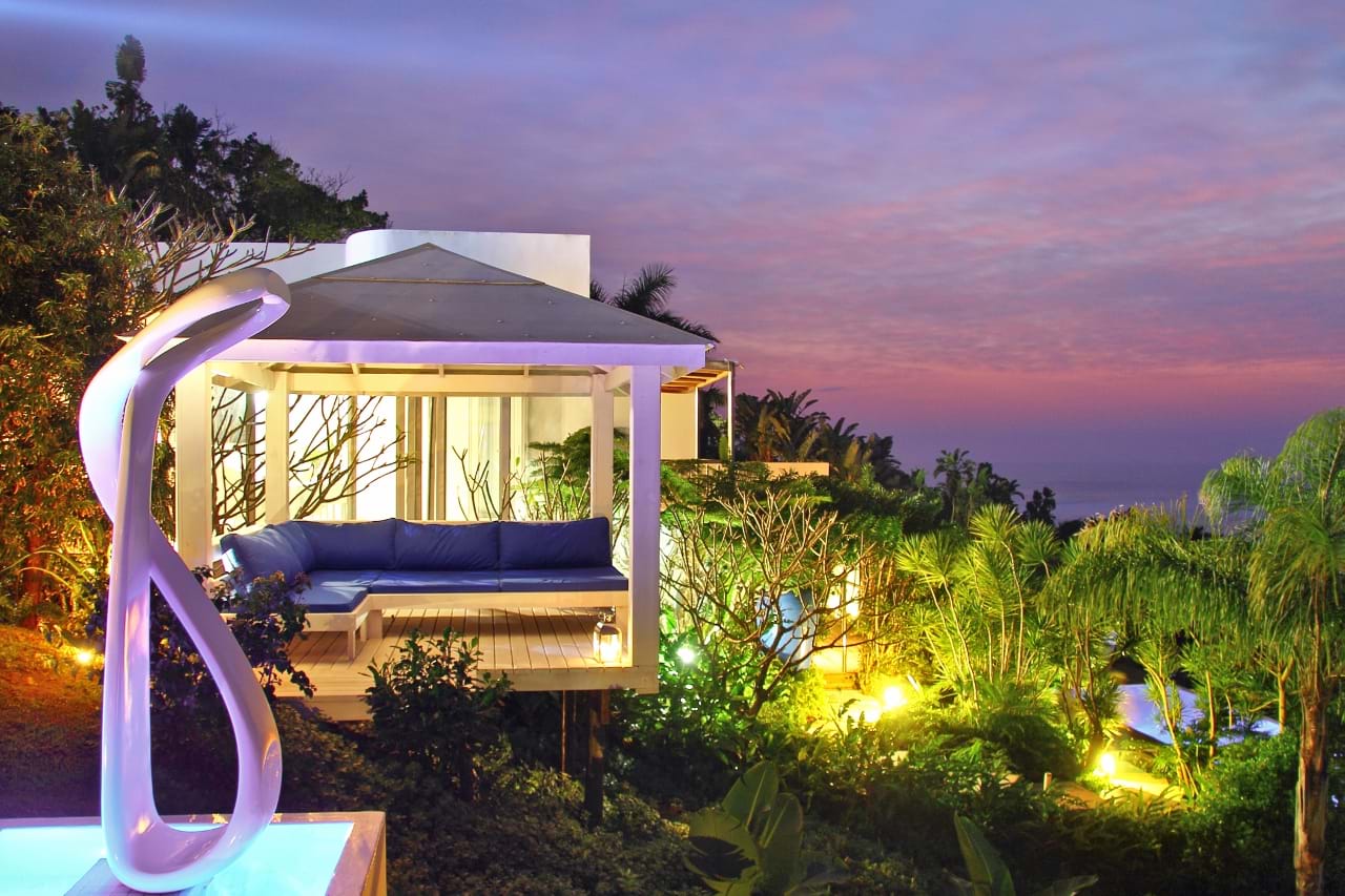 The European background of artist and photographer Dr. Guido Schoeldgen and his wife Annette, a fashion designer, is evident throughout. Clear-cut lines, refreshing pictures and sculptures with accompanying texts characterize the beachfront hotel. Each suite is a world on its own, a masterpiece of design in exquisite shades of aqua blue. The spacious pool set over the ocean is illuminated at night. Above it are the restaurant and lounge with projected images and music ranging from Pavarotti to Cafe Del Mar. The chef makes suggestions, the guests decide and then enjoy – fusion cuisine, a combination of Italy and France with a dash of Asia,fusion cuisine as Guido jokingly calls it. The five-star boutique hotel is surrounded by three world-class golf courses “ Wildcoast, San Lameer and Southbroom – and several leading game reserves, home to the big five, are within driving distance. The team of the hotel deals in a cheerful yet discreet manner with queries or requests. With breakfast served in bed or on the private terrace, the hotel is a haven not only for honeymooners. The owners philosophy? – there’s no such thing as no can do!