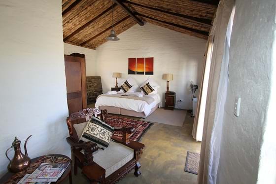 TThree star and AA Highly recommended Cottage that sleeps 6 in three bedrooms with two bathrooms, kitchen and lounge with fireplace. Meals available. Standard Double en-suite bedrooms have twin or Queen/King beds. Larger Twin or Kingbedrooms have a sleeper couch for children to be able to share the room with their parents. Hiking, Biking, Birding or visit Nieu-Bethesda. The cottage price is for the unit on self catering basis. The double en-suite bedrooms prices are on B & B basis.