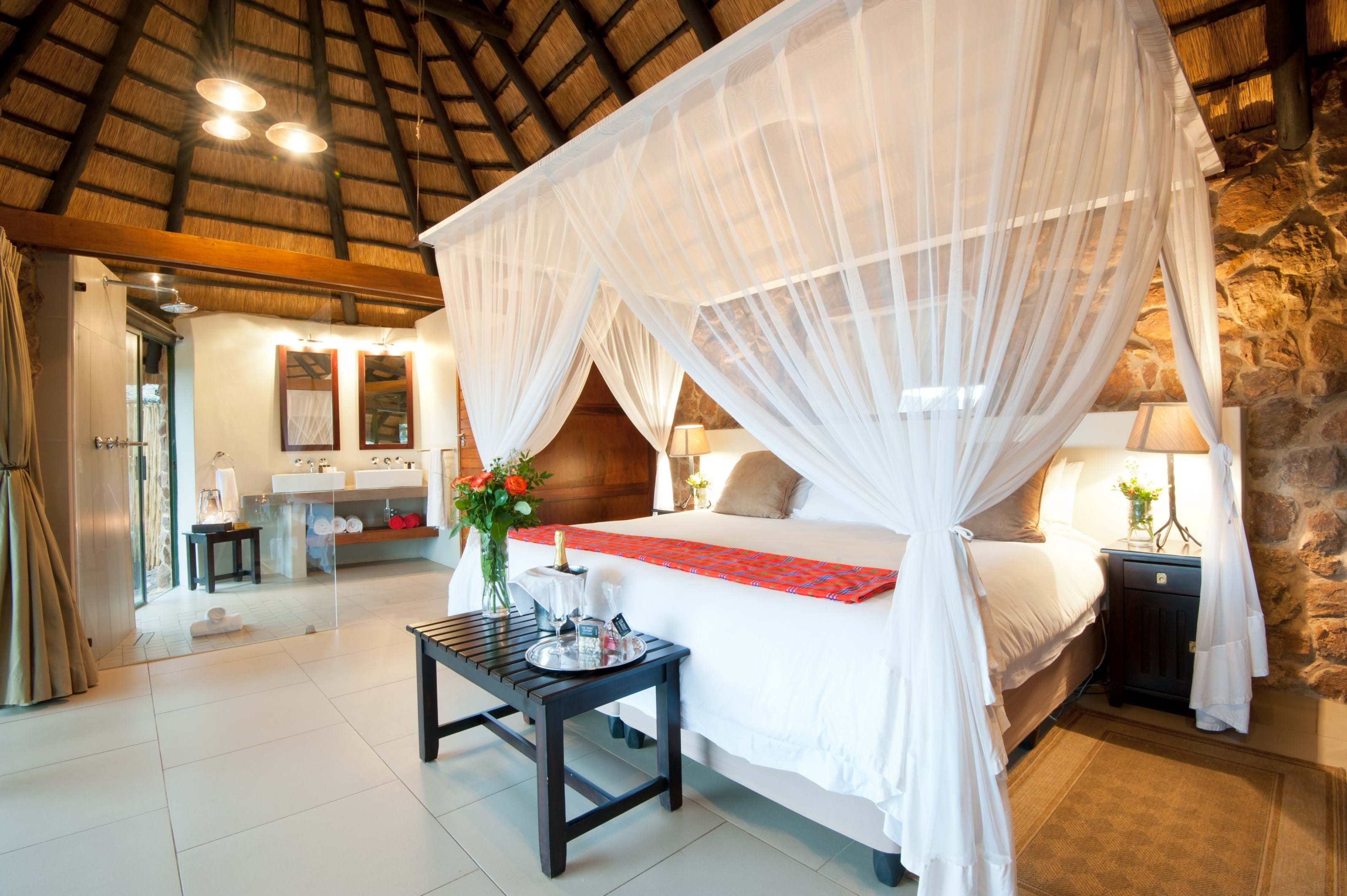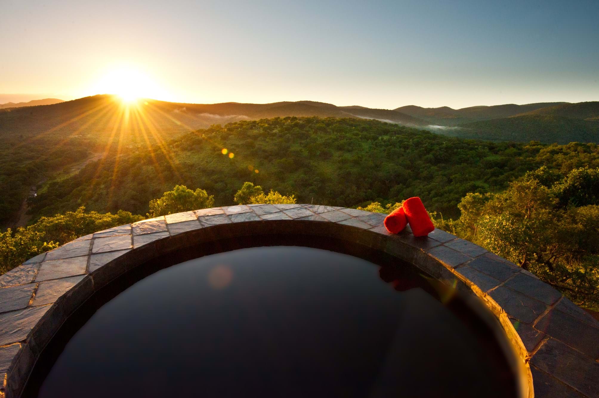 AA Big 5 multiple award winning lodge, set within an Endangered Species Protected Area in the magnificent Manyoni Private Game Reserve, offering peace and tranquility with friendly hospitality. Our beautiful lodge has the most spectacular views in Zululand, from the river meandering below to the distant Lebombo Mountains. Our game drives take you through well stocked, unspoilt bush veld and endless rivers winding through indigenous forest, a birders paradise. Our guided walking safaris offer an intimate encounter with the African bush veld and wildlife, taking you to places beyond the reach of vehicles. Join our mid day waterhole lookout activity to watch an array of animals coming down to drink from our unique waterhole setting or indulge in a pampering treatment at our amazing Africology Spa. Luxury accommodation in 9 well appointed, stone chalets with a hammock and private plunge pool nestled in the cliff tops overlooking the river below. Our sought after chef will prepare your tantalizing meals, which can be accompanied by your choice of wine from our multi-award winning cellar.Entrust us with those special occasions. Our picture perfect backdrop lends itself as an intimate setting for a romantic wedding, honeymoon or just a well deserved break.