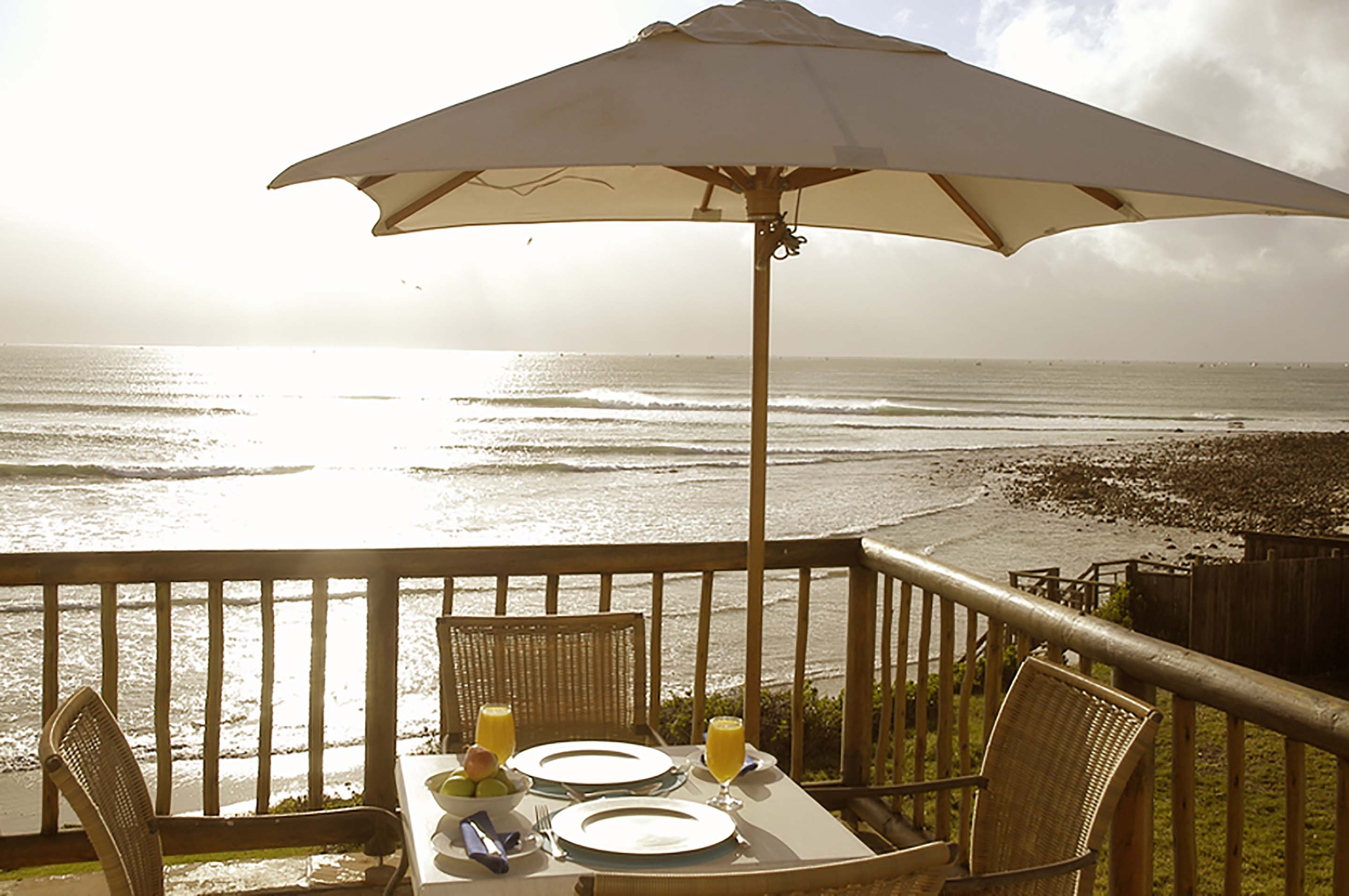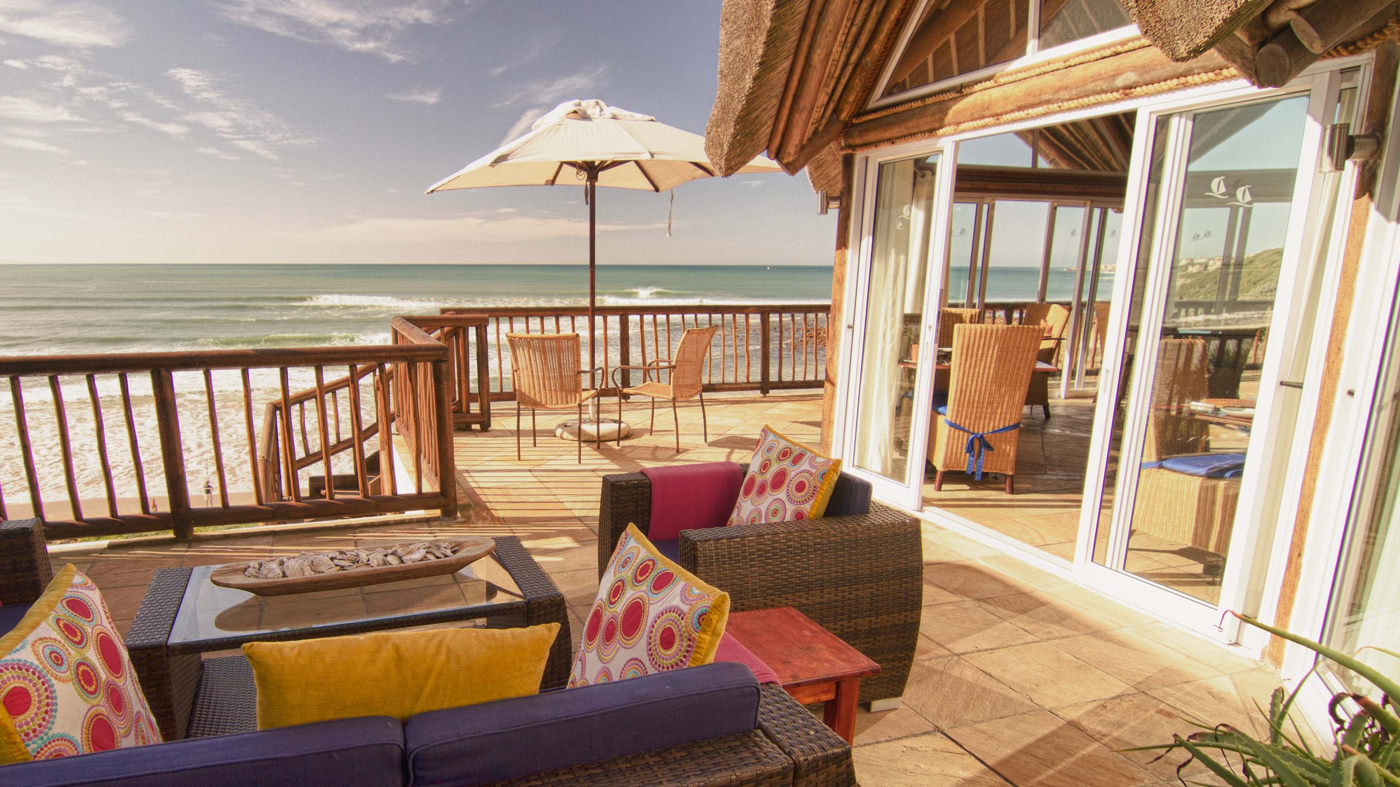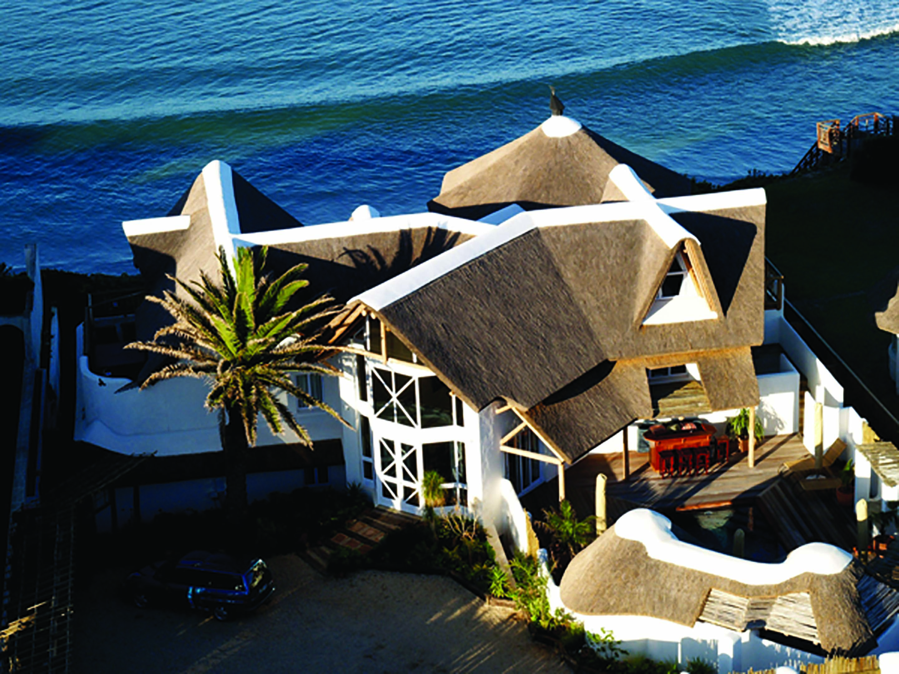 RRolling waves, dolphins and whales are the welcome that awaits at The Sands, an impressive white-walled thatched-roof residence with sweeping views of the sun-drenched beach and glistening sea. A relaxed and informal atmosphere is reflected in the African beach style décor. Spacious air-conditioned bedrooms offer luxury and style, each opening onto a private deck with breathtaking views of the beach below. Comforts include mini bar fridge, tea and coffee tray, hairdryer, television and safe. Generous classic bathrooms offer terry towel robes, separate showers, jacuzzi bath tubs and bidets, some rooms have an outside shower and jacuzzi on their timber deck. The octagonal glass-fronted restaurant, with its thatched roof, central fireplace and cocktail bar, invites you to delight in the panoramic views from its 300-degree vantage point. Generous breakfasts, light lunches and gourmet dinners. The Director’s Cellar offers a superb selection of estate wines. Soak up the summer sun on one of the secluded pool decks, relax in the steam room or enjoy a refreshing jacuzzi. Beauty treatments and massage therapies available. Nearby activities include lighthouse and port tours, beach walks, horse riding, golf, tennis, paddle-skiing, deep-sea fishing and canal cruises. An hour’s drive from Port Elizabeth and private game reserves. TGCSA 5-Star Hotel.