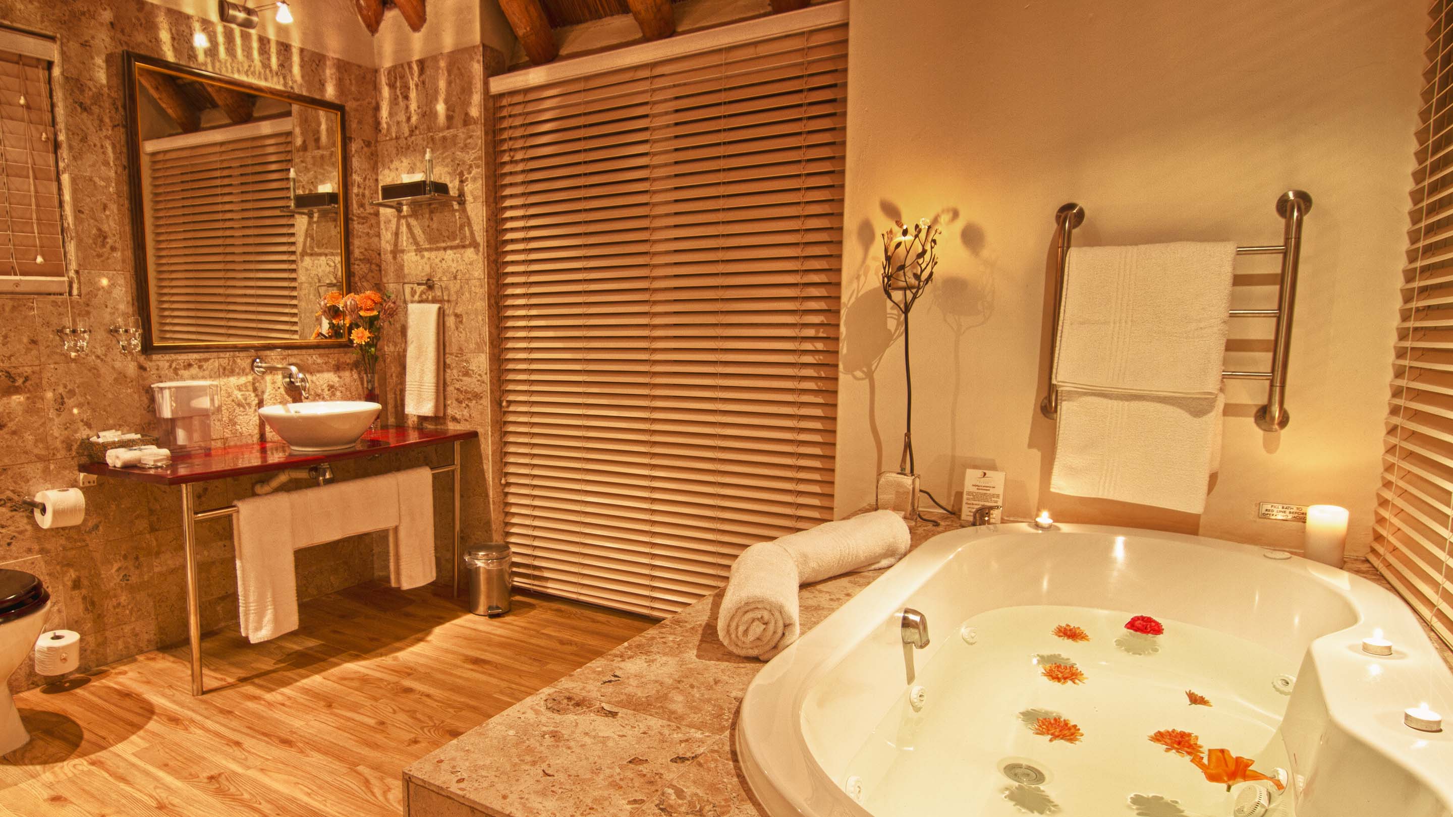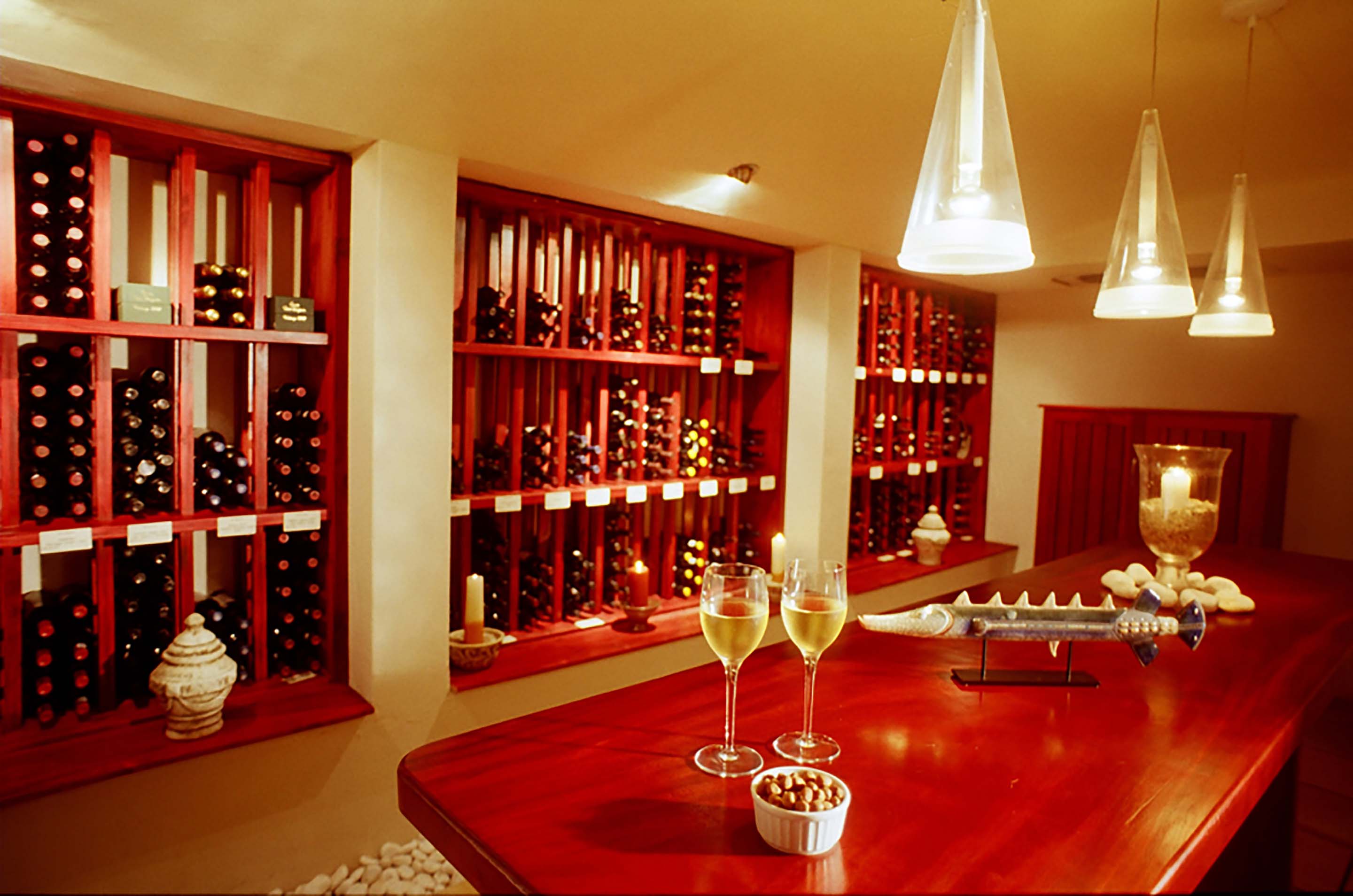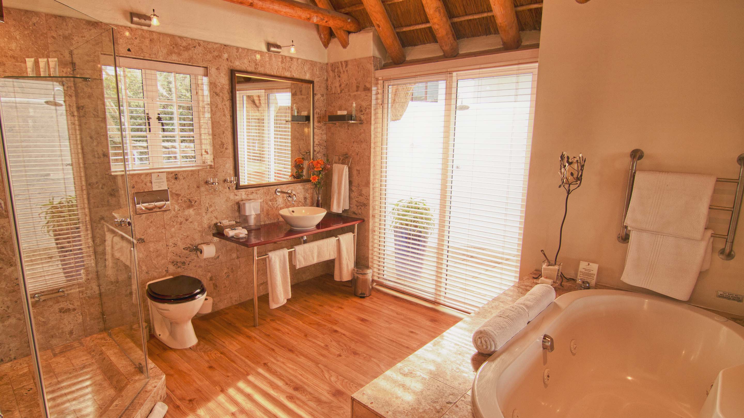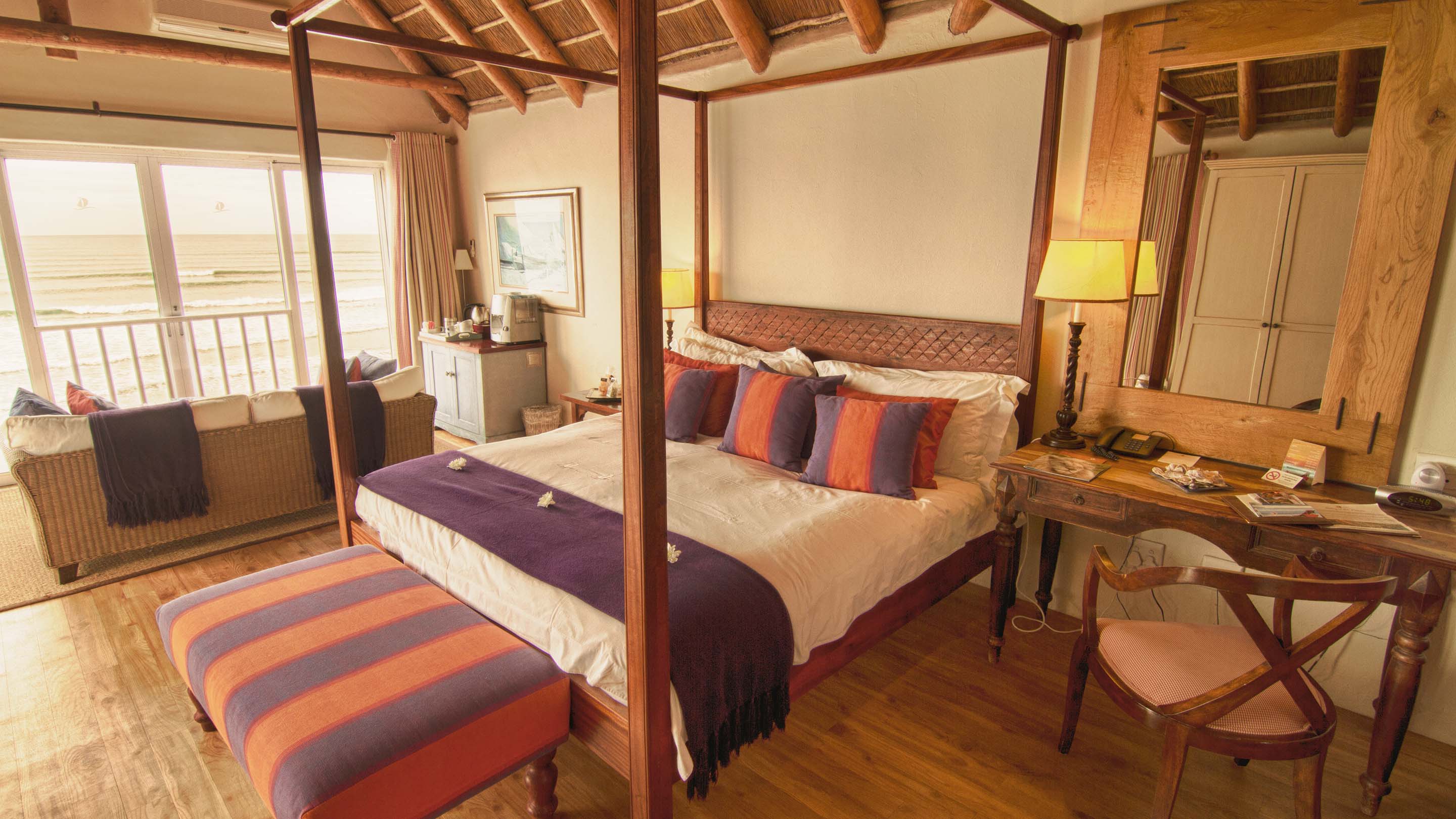 RRolling waves, dolphins and whales are the welcome that awaits at The Sands, an impressive white-walled thatched-roof residence with sweeping views of the sun-drenched beach and glistening sea. A relaxed and informal atmosphere is reflected in the African beach style décor. Spacious air-conditioned bedrooms offer luxury and style, each opening onto a private deck with breathtaking views of the beach below. Comforts include mini bar fridge, tea and coffee tray, hairdryer, television and safe. Generous classic bathrooms offer terry towel robes, separate showers, jacuzzi bath tubs and bidets, some rooms have an outside shower and jacuzzi on their timber deck. The octagonal glass-fronted restaurant, with its thatched roof, central fireplace and cocktail bar, invites you to delight in the panoramic views from its 300-degree vantage point. Generous breakfasts, light lunches and gourmet dinners. The Director’s Cellar offers a superb selection of estate wines. Soak up the summer sun on one of the secluded pool decks, relax in the steam room or enjoy a refreshing jacuzzi. Beauty treatments and massage therapies available. Nearby activities include lighthouse and port tours, beach walks, horse riding, golf, tennis, paddle-skiing, deep-sea fishing and canal cruises. An hour’s drive from Port Elizabeth and private game reserves. TGCSA 5-Star Hotel.