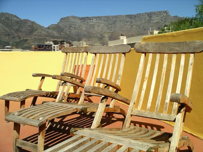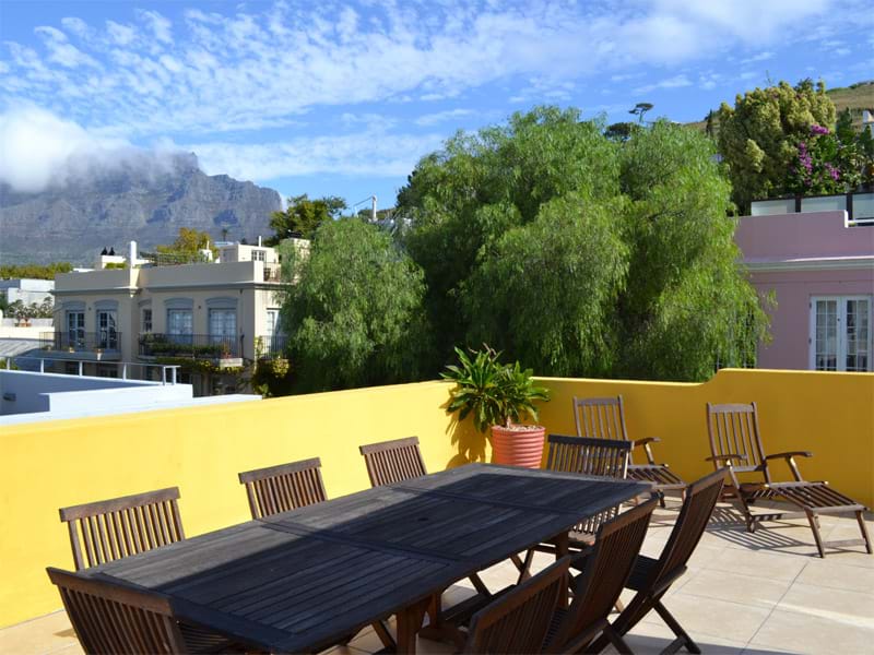 The ground floor with painted wooden floors has an open plan air-conditioned living, dining and kitchen area with glass ceiling that is overlooked by the terrace above. The two air-conditioned bedrooms on the ground floor share a bathroom with shower. Upstairs the large air-conditioned master king size bedroom has a walk-in wardrobe with en-suite bathroom and opens out onto its own private terrace with seating. The central stairs continue up to the large roof deck with amazing views of Table Mountain and the City.