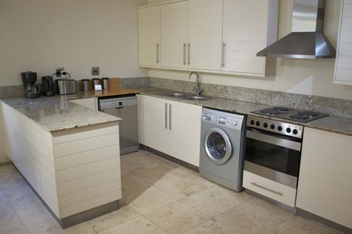 Modern in style and on one level there is an open plan kitchen, living and dining area which is air-conditioned. The two air-conditioned bedrooms lead off this area, one has a separate travertine bathroom with shower and the second bedroom has a walk in wardrobe that connects to the travertine tiled bathroom with luxury bath/shower.