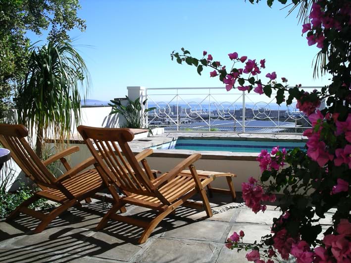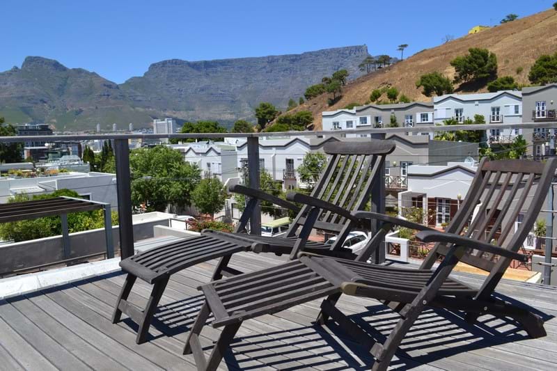 Upstairs the master air-conditioned bedroom has a large en-suite bathroom with whirl pool bath. French Windows open onto a private balcony with views of the Harbour and City. Along a corridor the third air-conditioned bedroom has an en-suite bathroom with shower. This room opens onto a deck with seating and views of Signal Hill and Table Mountain. Spiral stairs lead you to the top roof deck with 360 degree views of the city, harbour, Signal Hill and Table Mountain.