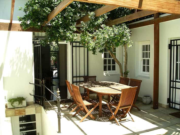 This luxury two bedroom property has an open plan living & dining area and kitchen with wooden floors and fireplace. The air-conditioned front bedroom with en-suite bathroom has a shower and a bath whilst the second air-conditioned bedroom has an en-suite with shower and has doors that open out onto the private pool terrace area. This area with shaded table and seating looks across the solar heated pool and a spiral staircase leads you up to a roof deck with sun-lounges and spectacular views of Table Mountain, the City & the Waterfront.