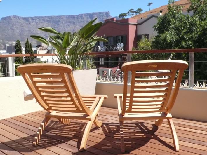 This popular property has a wooden sun deck above the garage with Jacuzzi and views of Signal Hill and Table Mountain.