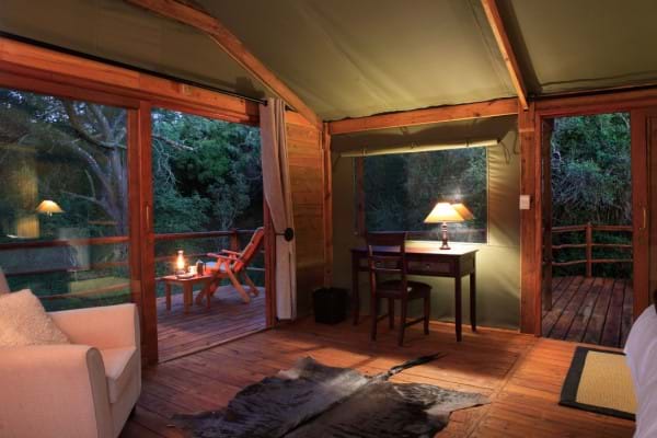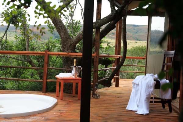 The tented eco-Lodge is perfectly designed to blend discreetly into its surrounding valley bushveld environment; the remarkably spacious, sophisticated suites - some nestled in the Yellowwood forest and others set on a hillside offering extraordinary views - are elevated on wooden decks each with outdoor spa bath. Luxuriously decorated to evoke Hemingway’s Africa of yesteryear, this is an oasis of calm affording quiet reflection against the tranquil backdrop of the African bush where giraffe, zebra, wildebeest and eland browse and graze at your doorstep. All meals of the day can be enjoyed at our open-sided restaurant which incorporates a bar area and open-air boma, all overlooking the elephants’ much loved waterhole.
