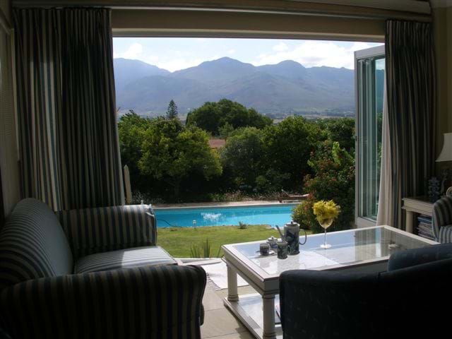 44 star Bed and Breakfast in beautiful historic Paarl, the centre of Winelands, Western Cape. 30 minutes from Cape Town. Cape Town International airport only 40 minutes drive. Located in a quiet, upmarket suburb, easy to find. Fantastic views to be enjoyed from the guesthouse over the Berg River Valley toward the Franschhoek Mountain Ranges and majestic Simonsberg.