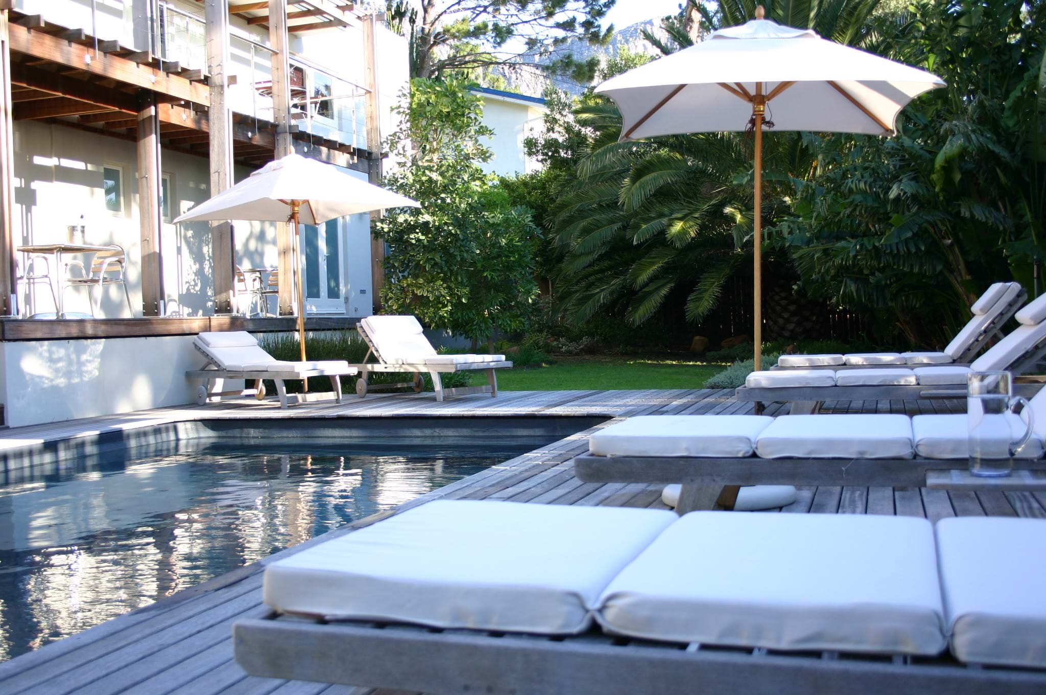 The saltwater pool is the central focus of the garden. Chaise lounges invite sunbathing and serene relaxation.