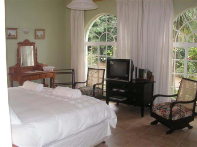 The Family Suite has 2 bedrooms, the Master Bedroom with a King size bed, the other with twin beds, sharing an en-suite bathroom with a bath, hand shower, basin and toilet. This spacious, cool Suite accommodates 4 persons, and overlooks the gardens and rock pool.