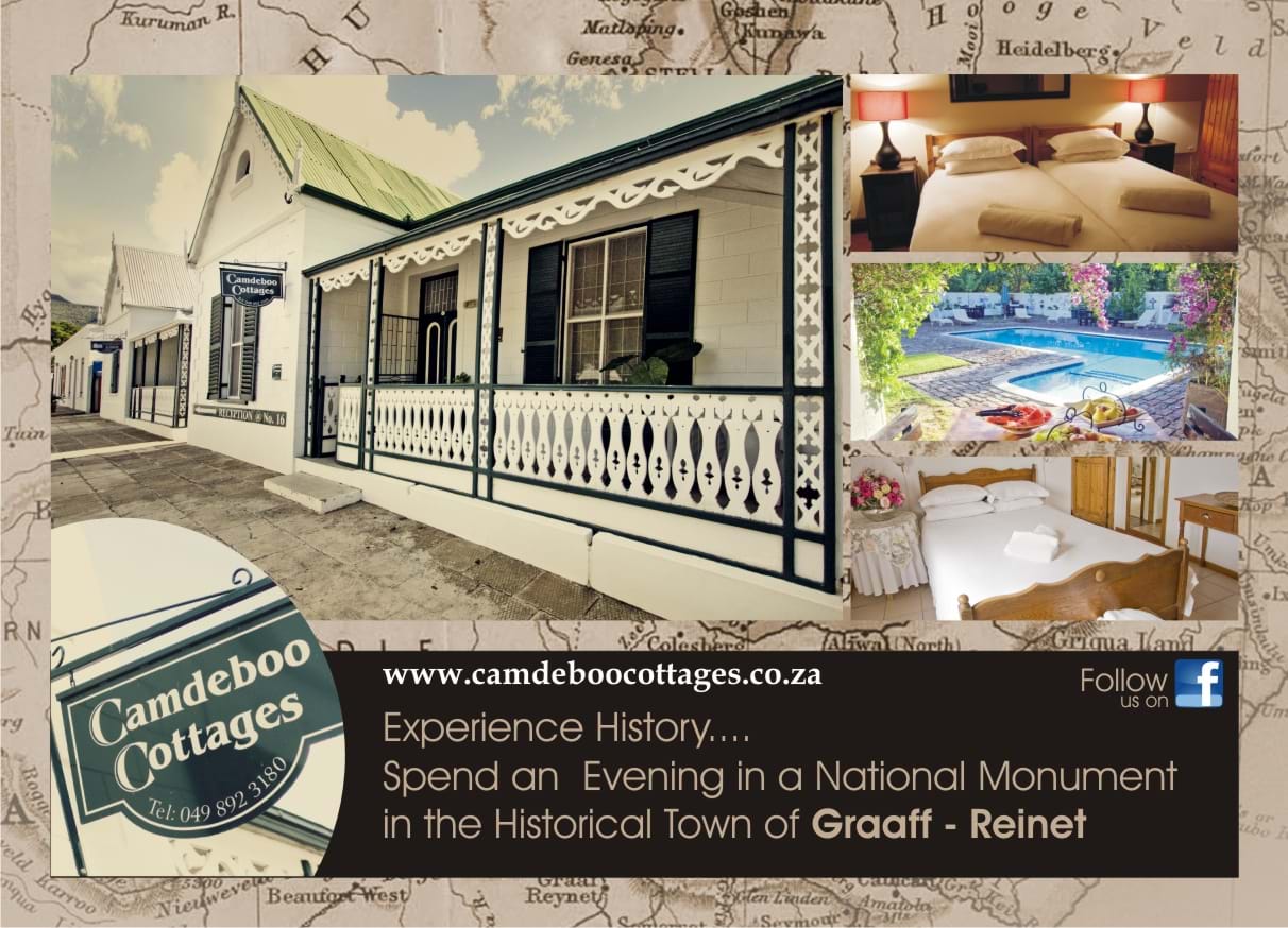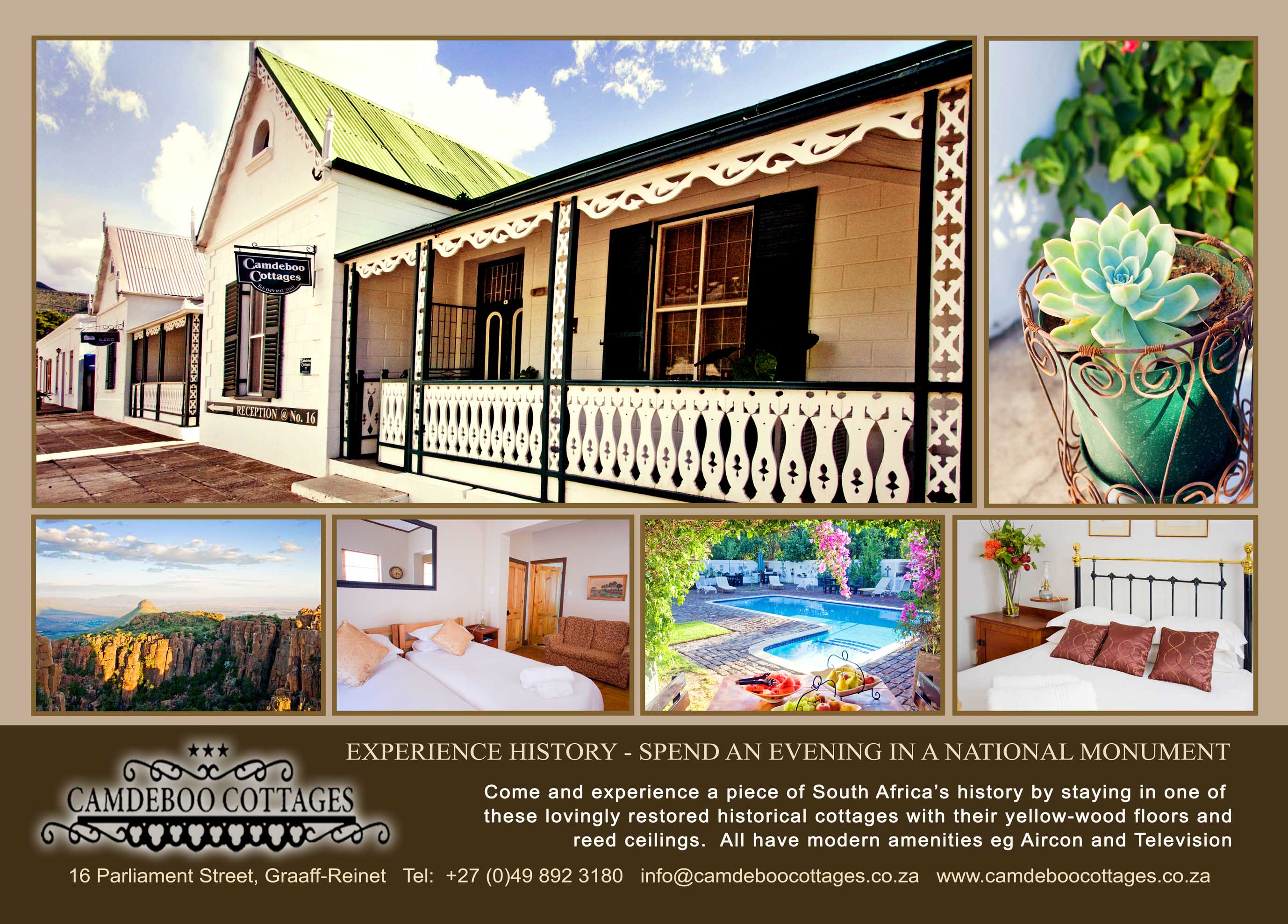 CCamdeboo Cottages is located in the heart of old Graaff-Reinet, on the corner of Bourke and Parliament Street, within walking distance of local attractions and facilities. Experience a piece of South Africa’s history by staying in one of these cottages which have been declared national monuments. The unique and historical cottages have been lovingly restored boasting original yellow-wood floors and reed ceilings together with modern amenities such as aircon and televisions.