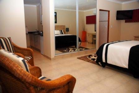 We offer fourteen stylish en-suite rooms equipped with all you need to ensure a luxurious and pampered stay. Each of our rooms is individually furnished with tea and coffee making facilities, fridge, air conditioning, hair dryer, safe and remote controlled flat screen television sets with DSTV/MNet channels. Eleven of our rooms are also equipped with kitchenettes.