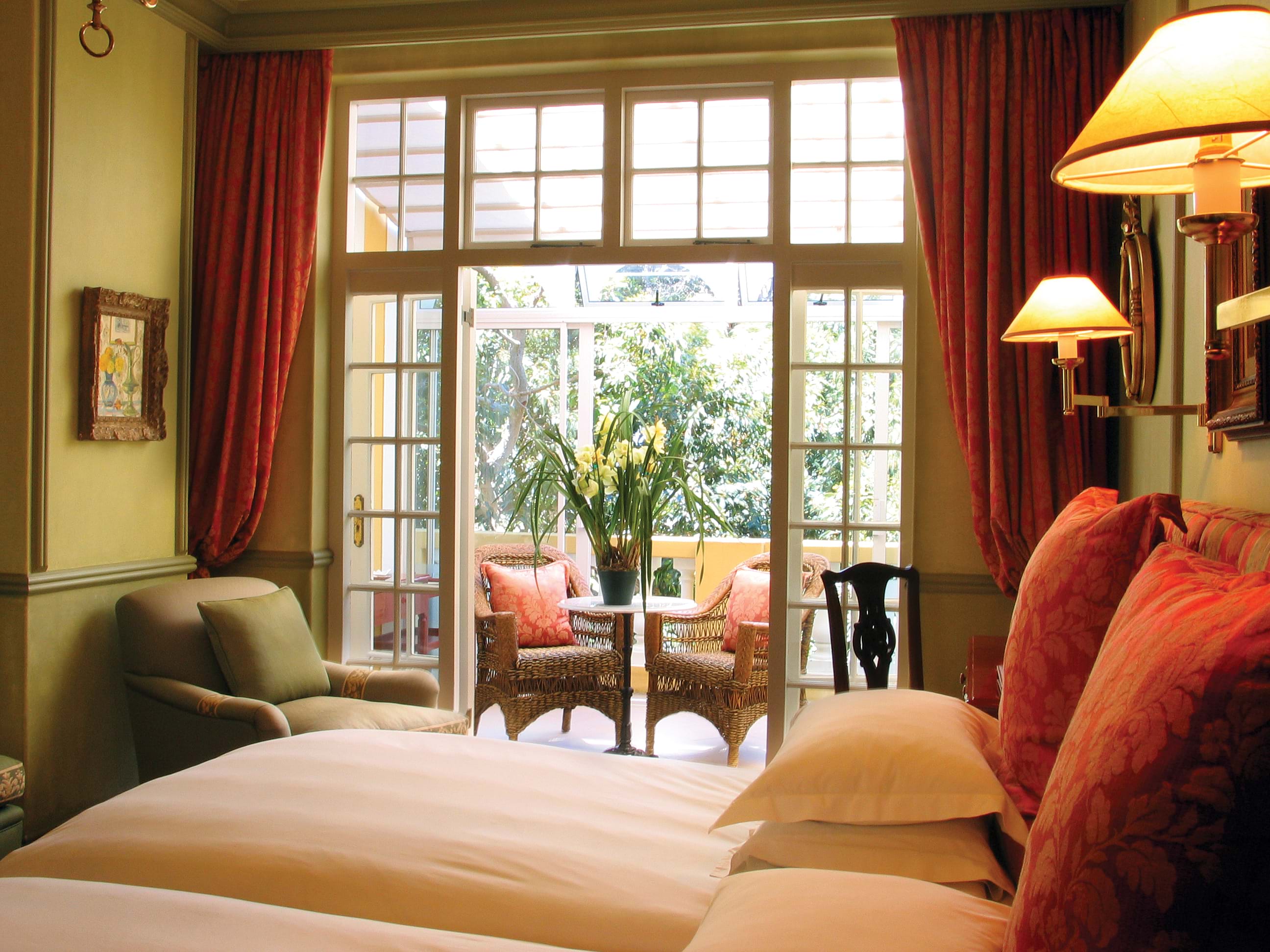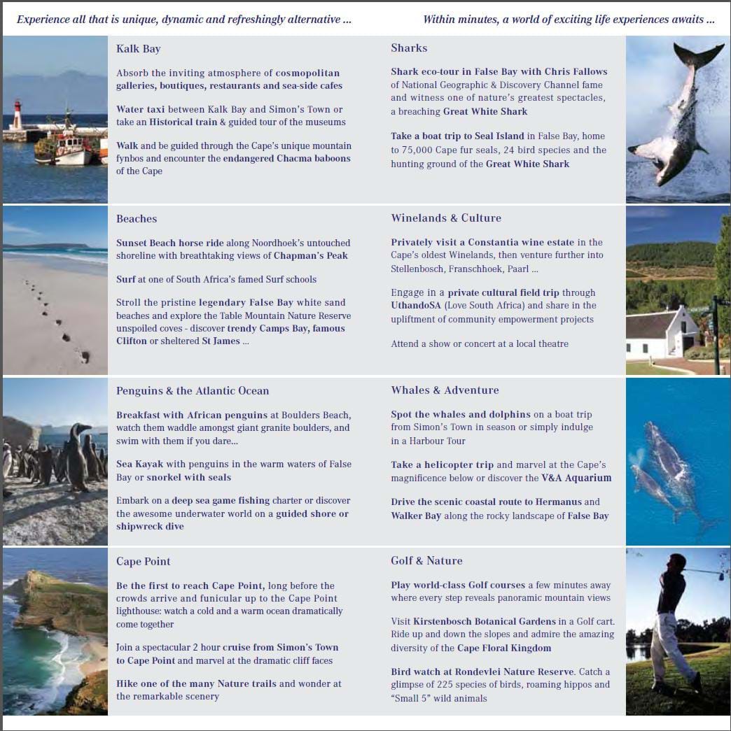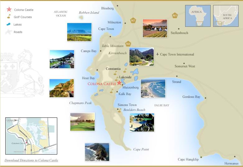 AA position at the epicentre of greater Cape Town allows easy access to Table Mountain (25 minutes), the penguin colony at Boulders Beach (15 minutes), Cape Point Nature Reserve (30 minutes), the Waterfront (20 minutes) and the Winelands (Constantia 10 minutes-Stellenbosch 30 minutes). Gracing the mountainside above a tranquil Lake District on the warmer False Bay coastline, Colona Castle, graded 5-Star, is a splendid Mediterranean retreat from which to explore fascinating Cape Town and environs, offering character, exclusivity and infinite charm. Majestic panoramic views stretch from Table Mountain across the Peninsula and Winelands to False Bay and the South Atlantic Ocean. All Suites and interiors are furnished with treasured antiques and objets d’art collected over many years. Four sumptuous Suites, one Family Suite and two Superior Bedrooms cater for every comfort and convenience. Therapeutic Massages and Spa Treatments are available upon request.