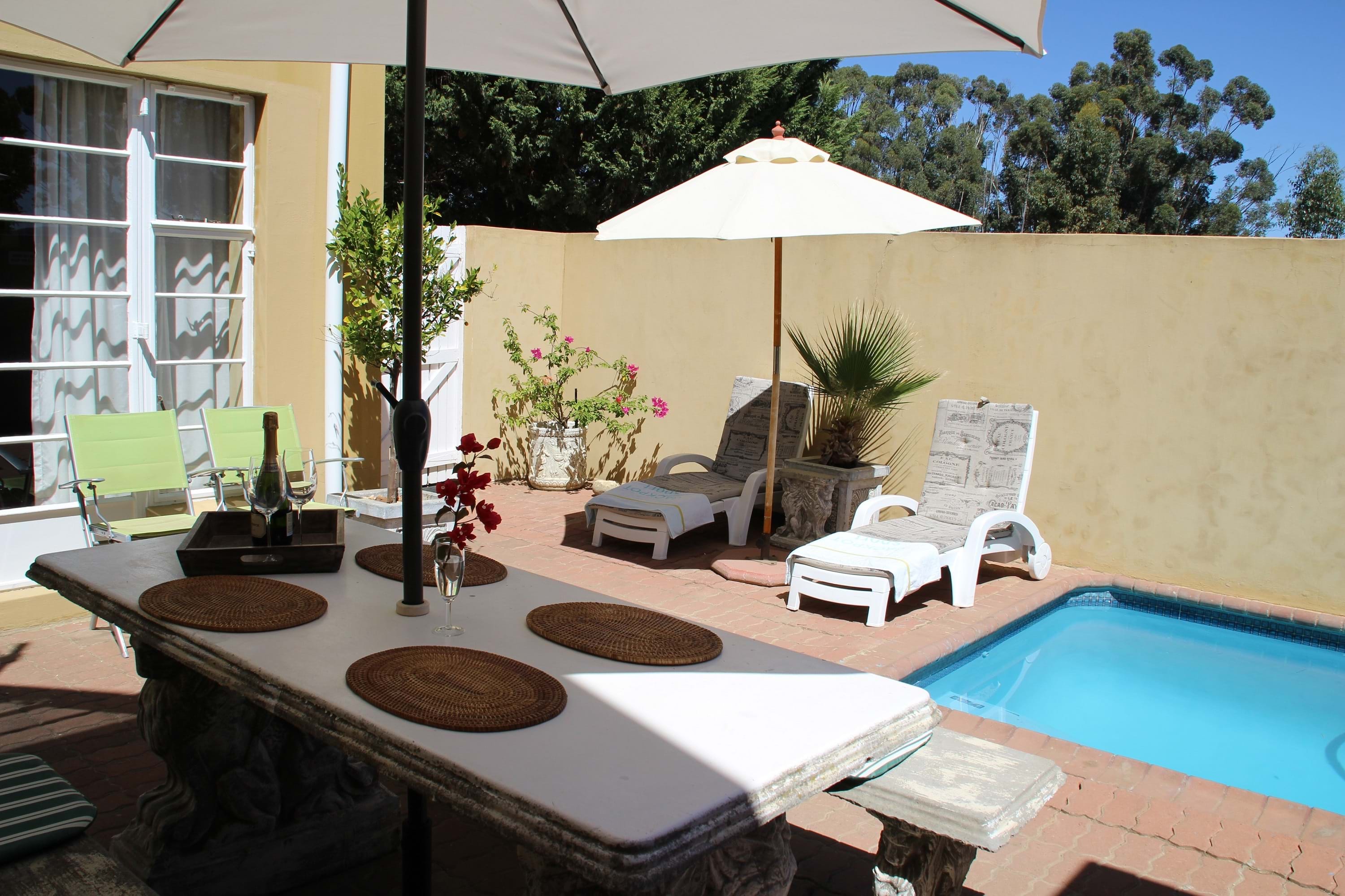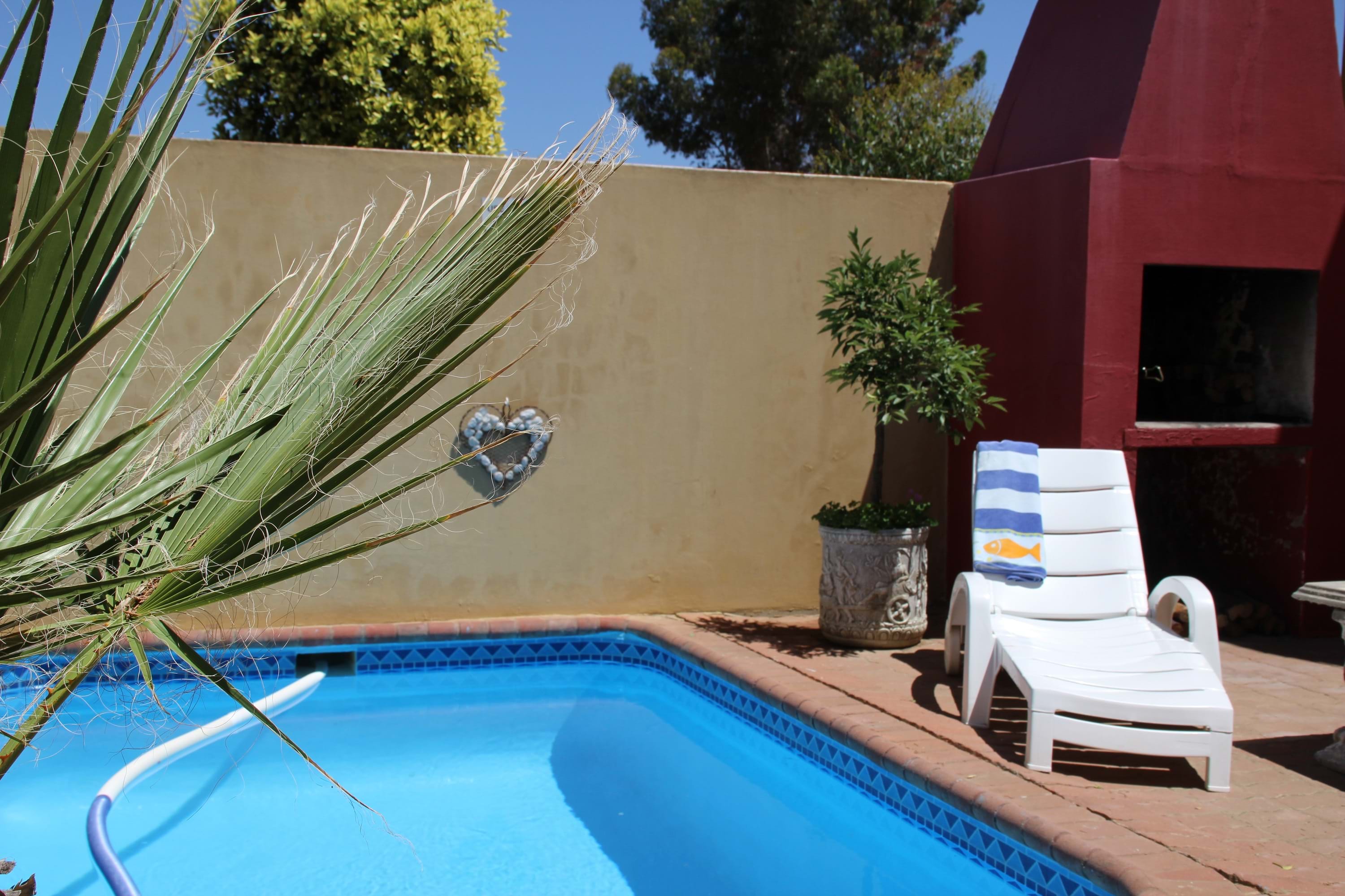 The dining / lounge area has two sets of large double doors that lead out onto an enclosed patio with swimming pool, outdoor seating area and a braai area The kitchen is well equipped with oven and hob, microwave, large refrigerator and everything you would need to cater for a sit down dinner for 8 guests. The dining room table seats 8 very comfortably if you decide to dine indoors rather than enjoy the outdoor barbecue area.
