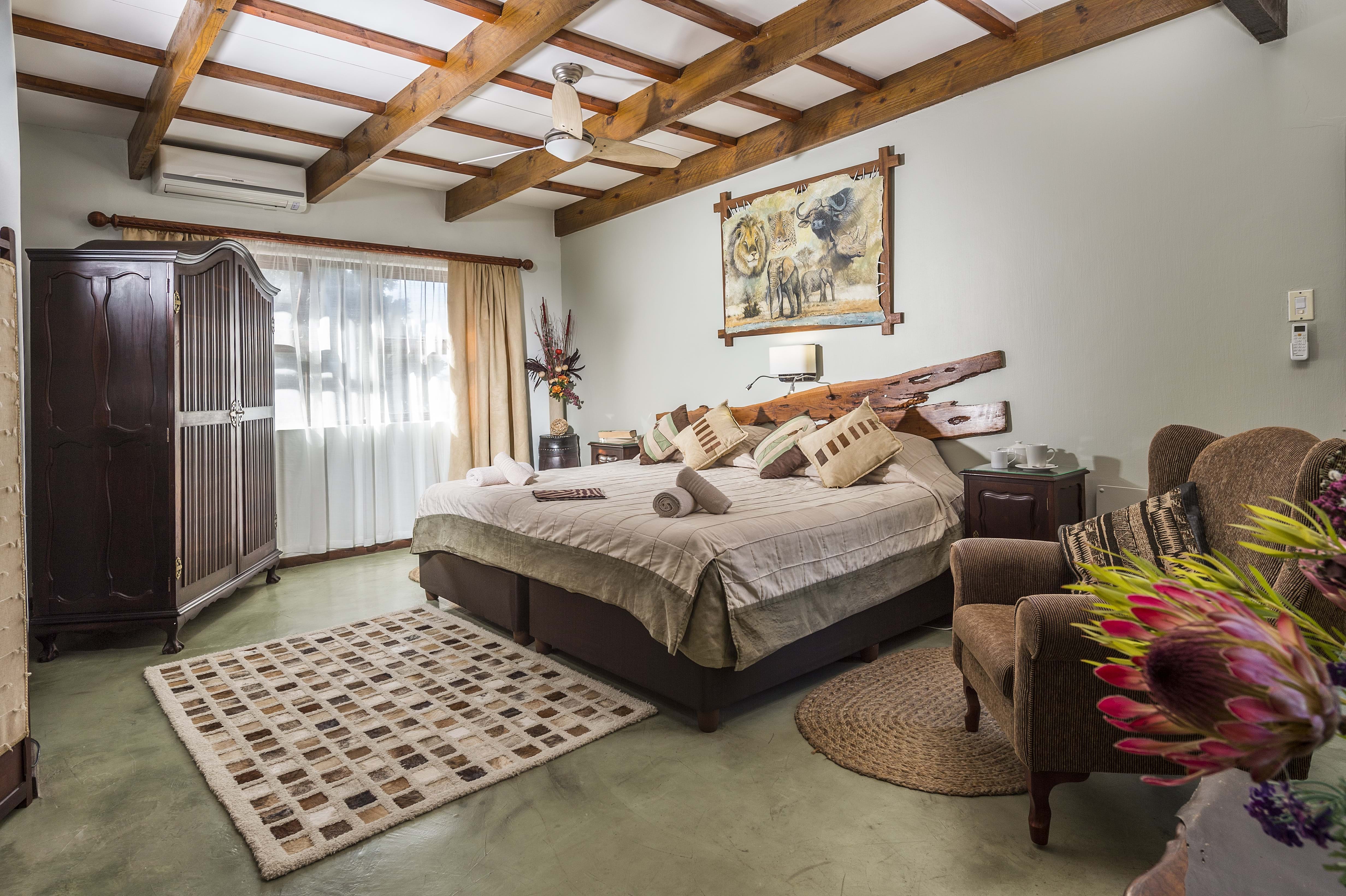 The guest house has 6 up-market large safari type bedrooms, with old world furnishings, subtly decorated to give you a classy colonial Africa feel, with all the luxuries expected of a 4 Star graded establishment.