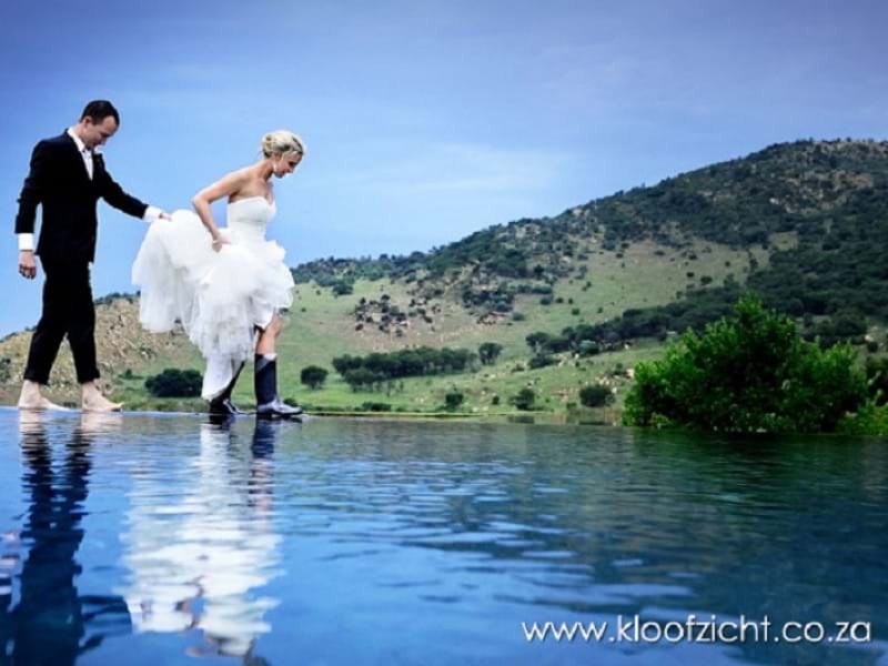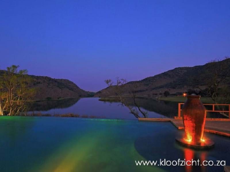 Guests entering the luxurious Kloofzicht Lodge are greeted with the stunning vista of endless stretches of water as the infinity pool spills over into the Kloofzicht dam, finally settling into the Zwartkops mountains in the distance.