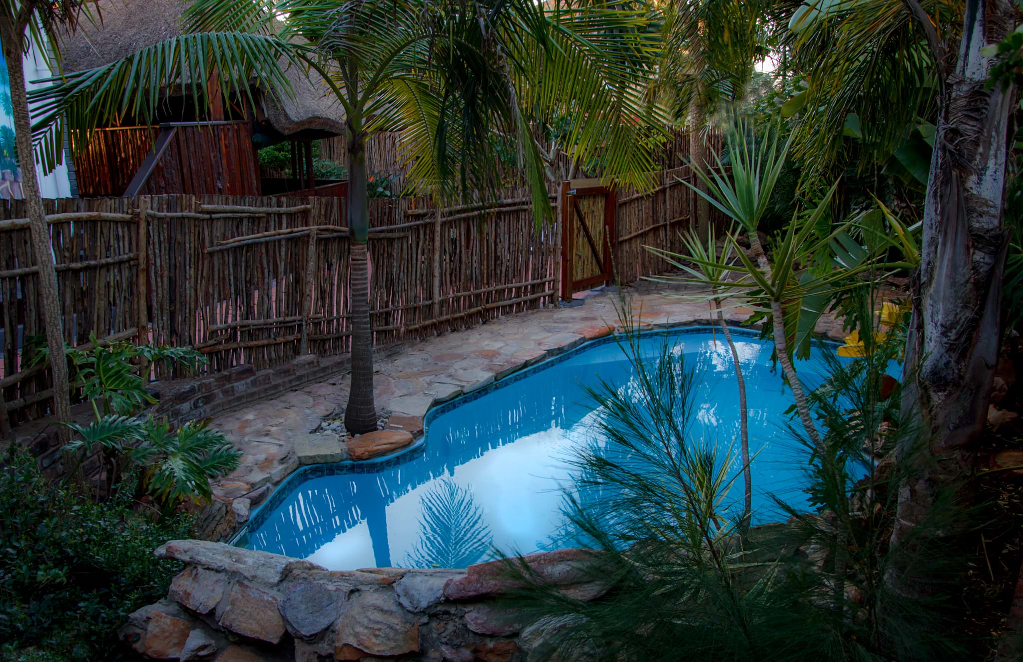 The rustic Lapa and braai area is set in a tranquil garden that leads to a tropical pool, a koi fishpond and designated private nook.