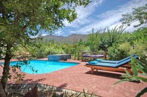 The guest lounge overlooks the lovely secluded garden with beautiful views of the Langeberg mountains. Take a refreshing dip in the swimming pool or laze in the shade in a comfortable lounge chair.