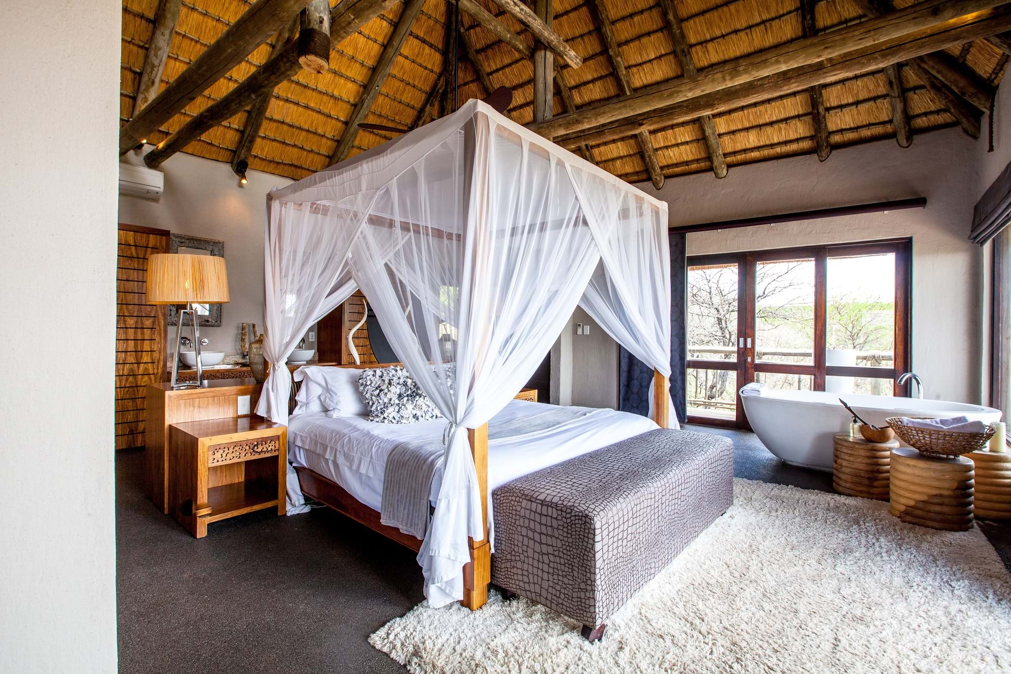 TThe five-star Nambiti Hills Private Game Lodge offers intimate and luxurious accommodation in the midst of the spectacular African beauty of the Nambiti Game Reserve. It is a haven of sophistication surrounded by wild terrain. Perfect for anyone seeking both privacy and romance. Or simply time to reflect whilst searching for the Big Five or taking in the exquisite vistas from the quiet comfort of the lodge deck. Ideal for private getaways for the discerning, Nambiti Hills has a unique combination of wide open spaces and discreet intimate places. Its lofty glass-enclosed dining and lounge areas provide panoramic views of rolling hills and savannah by day, and thousands of stars in the clear night sky. A wide verandah with its neighbouring bar spills out onto a waterfall that splashes into a rock pool where guests can float on cushions whilst sipping cocktails. Four indoor wood fires and two outdoor boma fires offer warmth and intimacy.