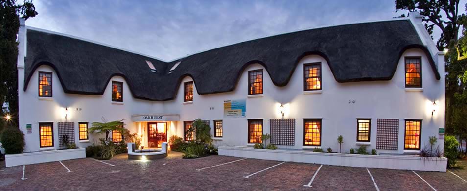 TThe thatched gabled hotel facing the Outeniqua Mountains, offers 25 Designer- decorated rooms, all with en suite bathrooms and air conditioning. All the rooms are complemented with modern amenities to please even the most discerning traveler. Disabled facilities. Outdoor swimming pool. The restaurant is open for breakfast, light luncheons and snacks. Lounge with large farmhouse fireplace. Ladies bar. Secure open parking. Wireless internet. Oakhurst boasts a unique dining experience, with a choice of several restaurants, all located in the immediate vicinity. The meeting place in the centre of George
