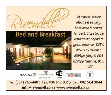 CConveniently situated in the cool climate of the picturesque village of Hillcrest, just 20 minutes from Durban and with easy access to both the N3 and M13 motorways, is Rivendell Bed & Breakfast.