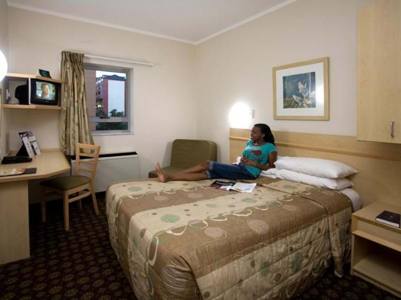 The rooms are fully-carpeted, air-conditioned and have colour televisions and radio stations, and feature en-suite bathrooms with shower, toilet and hand basin. The hotel has a choice between double or twin beds, with single sleeperchairs available in selected rooms. One in fifty rooms is designed to meet the special needs of the physically disabled. The hotel serves a light breakfast daily, and has a 24 hour vending machine stocked with snacks and beverages. There is a 24 hour reception service, ample and secure parking.
