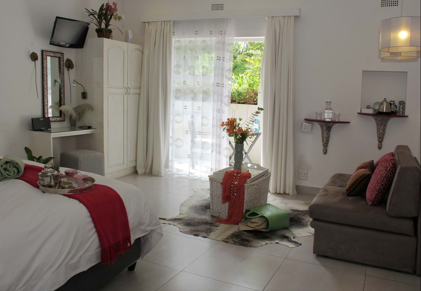 IIn a tranquil residential area, 2 minutes away from the Heads, Beaches and World-class golf courses, Patrick and Helene-Marie, offer warm and friendly hospitality to leisure and business guests. 6 Tastefully decorated rooms include DSTV, fan, safe, heater and tea tray. Each with private entrance and patio. 2 self-catering luxury cottages . Enjoy generous breakfast indoors out on the deck overlooking manicured gardens prolific with birdlife and the large pool. Children Welcome. Free WIFI. Dinner by arrangement. Golf and activities arranged. Laundry service. Off-street parking . TGCSA 4 Star Guest House . English, french and spanish spoken.