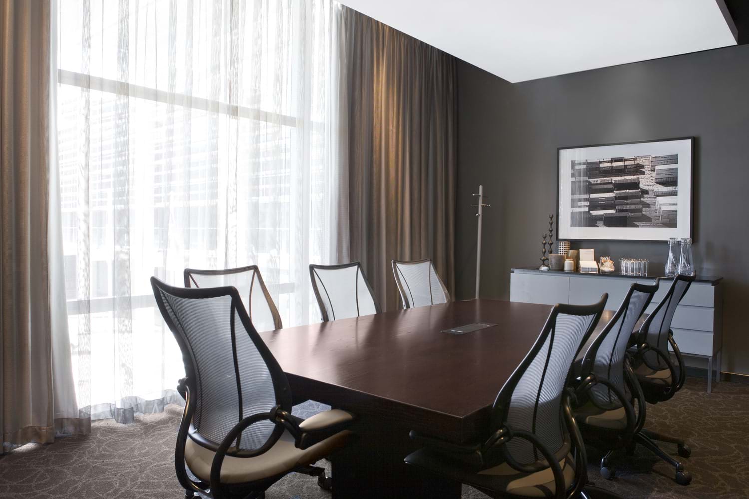 Standard conferencing equipment includes data projectors, overhead projectors, white screens, plasma screens, and sound equipment. All conference rooms are remote controlled allowing the client to control all aspects of the room, including the dimming of lights, closing and opening of the blinds, room temperature, and audiovisual equipment.