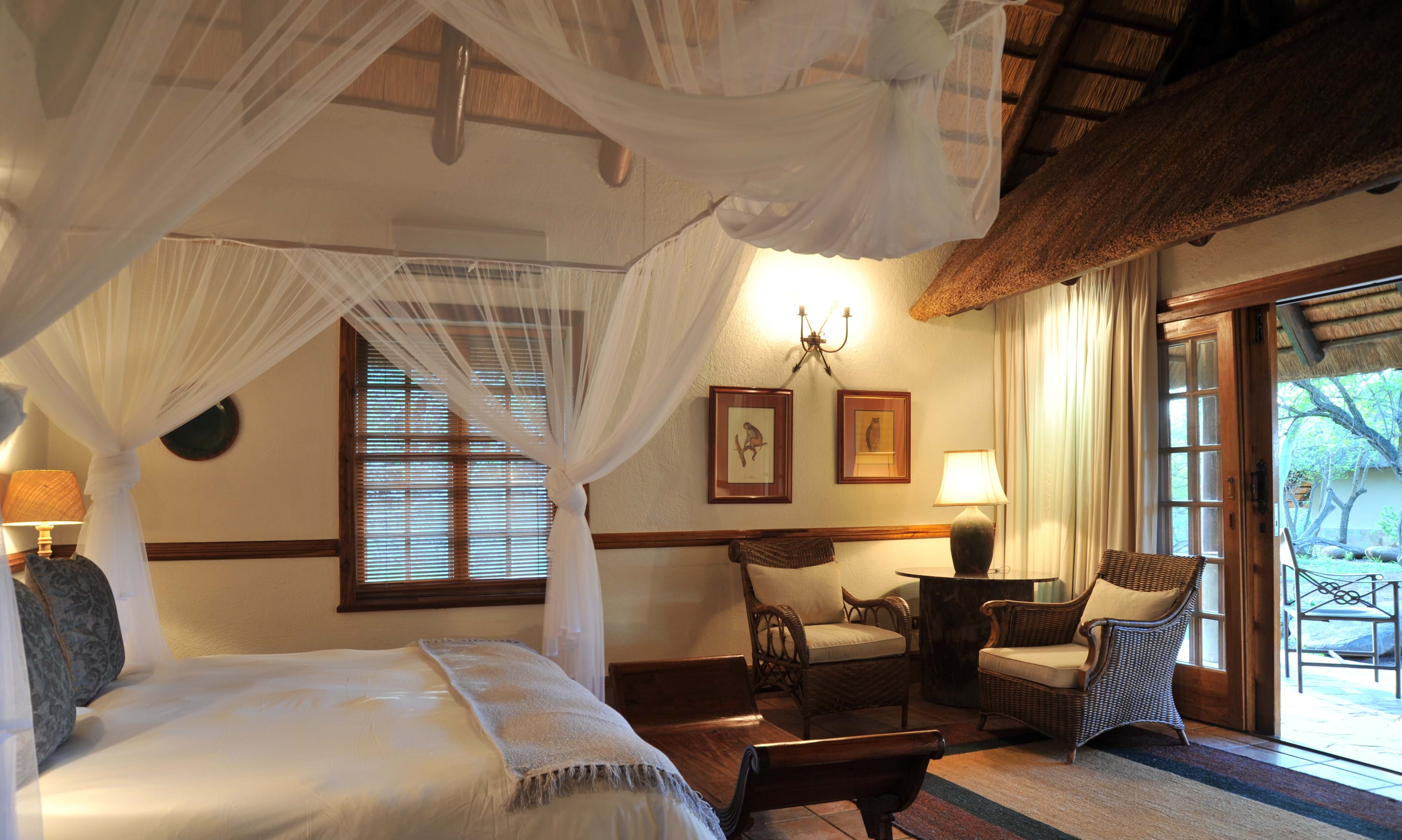 The Lodge’s 20 comfortably appointed air-conditioned thatch Suites blend into the natural habitat and are located along pathways surrounded by an abundance of trees and manicured gardens.