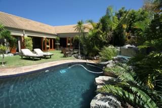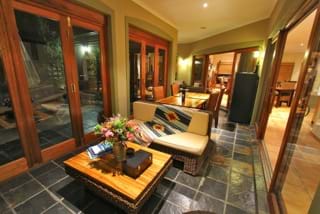 Each room is equipped with television, 400 count Egyption cotton linen, soaps, coffee & tea and the finest art and Bali décor. All rooms walk out onto a patio, each with their own easy chairs, connected to the pool and Jacuzzi set in the lush garden. The beautiful lounge and breakfast area has a fire place, where you can enjoy some of the Cape’s finest wines in the winter or in the Jacuzzi or pool in the summer.