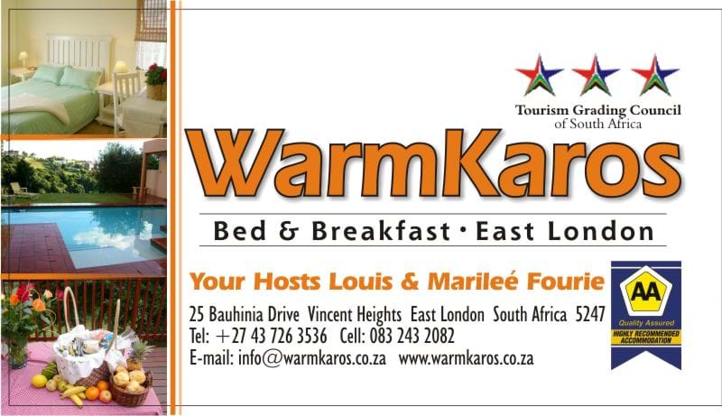WarmKaros Bed & Breakfast is a 20 minute drive from the East London Airport and close to the N2 from Durban, and N6 from Bloemfontein.