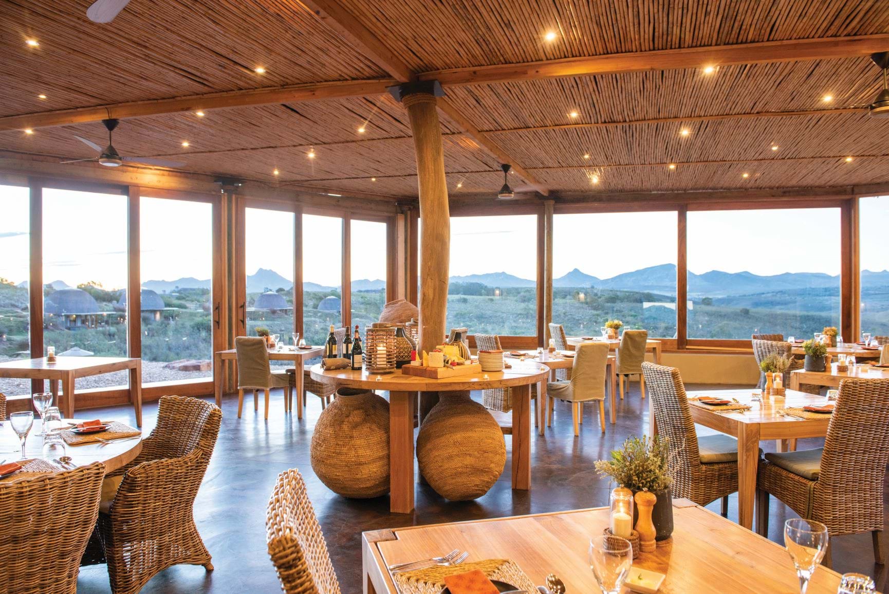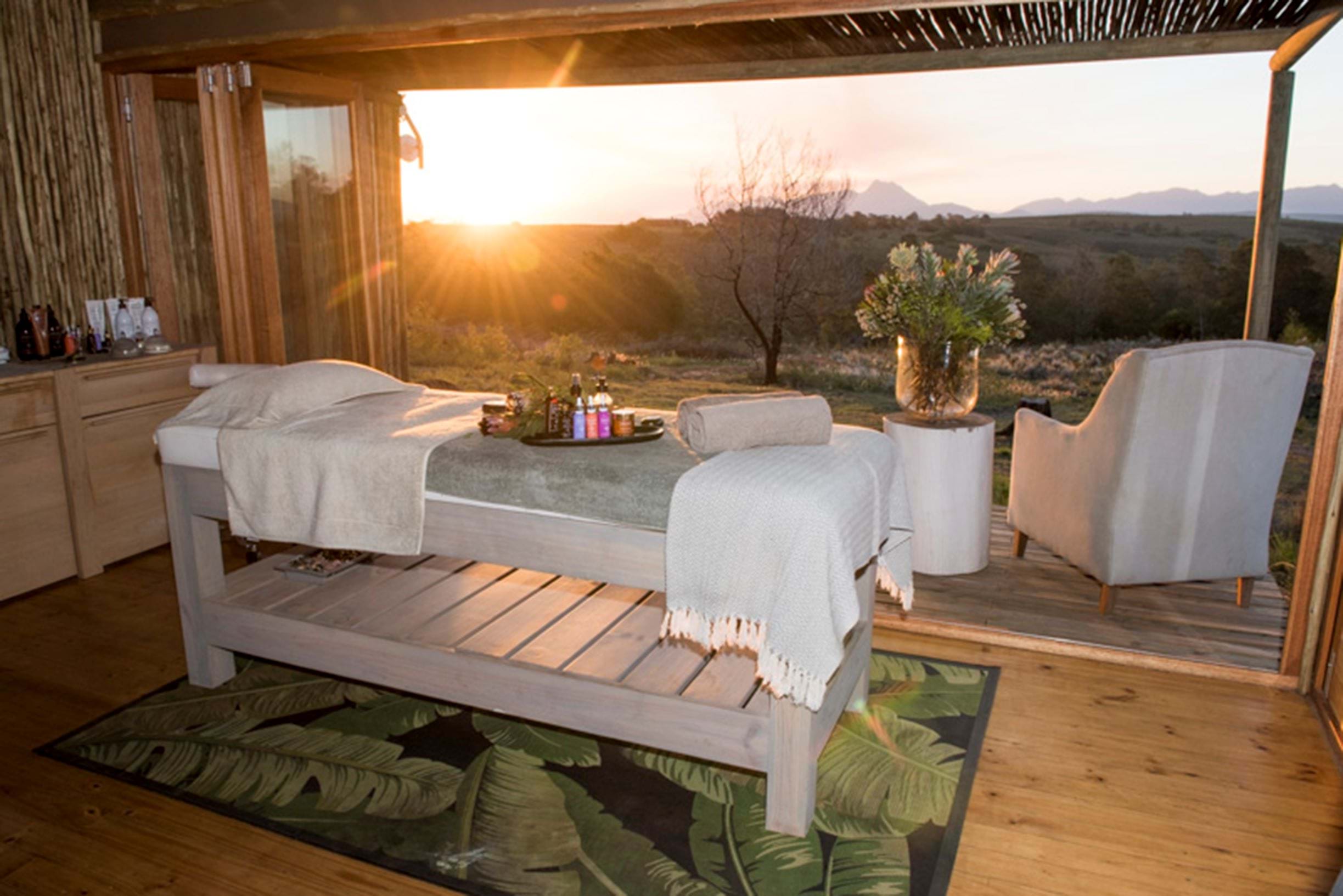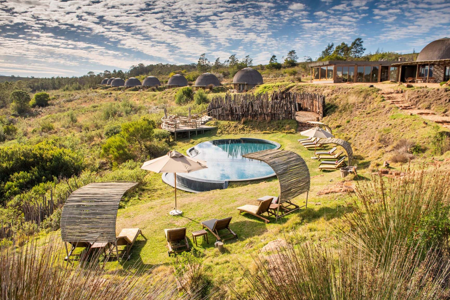 Je kunt in een hut verblijven die is geïnspireerd door de lokale Khoi San-cultuur, hoewel 'hut' een veel te bescheiden woord is. Elke bijenkorfvormige woning, gelegen op de berghelling, beschikt over een comfortabel hemelbed, een eigen badkamer en een houten terras met ligstoelen, heeft een uitzicht van 180 graden met uitzicht op het zwembad en de waterpoelen beneden, of op de omliggende Langeberg-bergen. Er is zelfs een dakraam zodat je in bed kan liggen en naar de schitterende sterren kant staren.